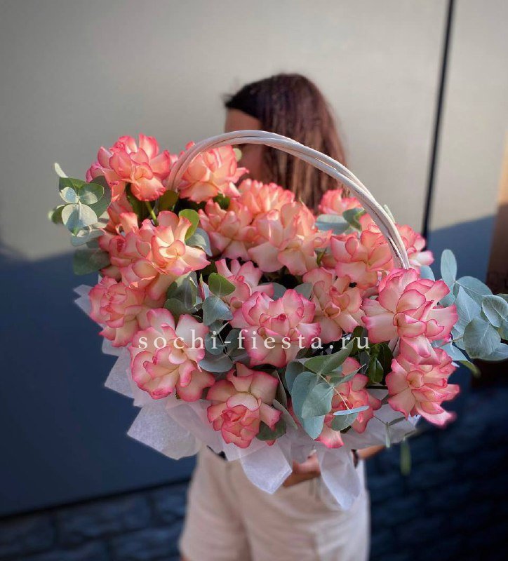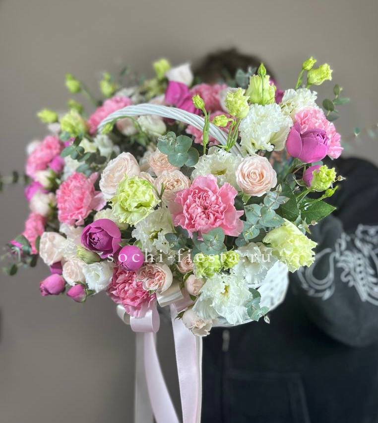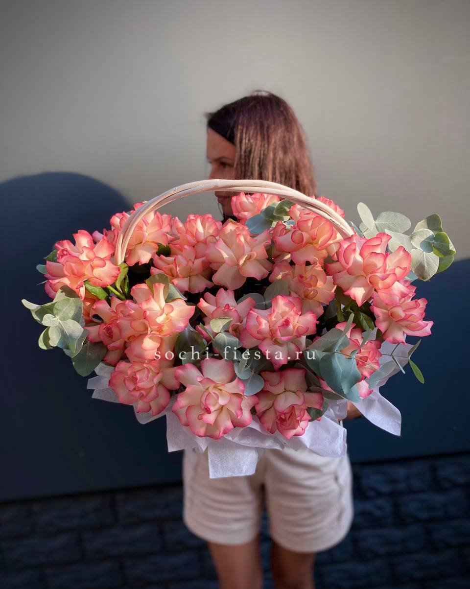 41 пионовидная кустовая роза Misty Bubbles, эвкалипт, светлая корзина.