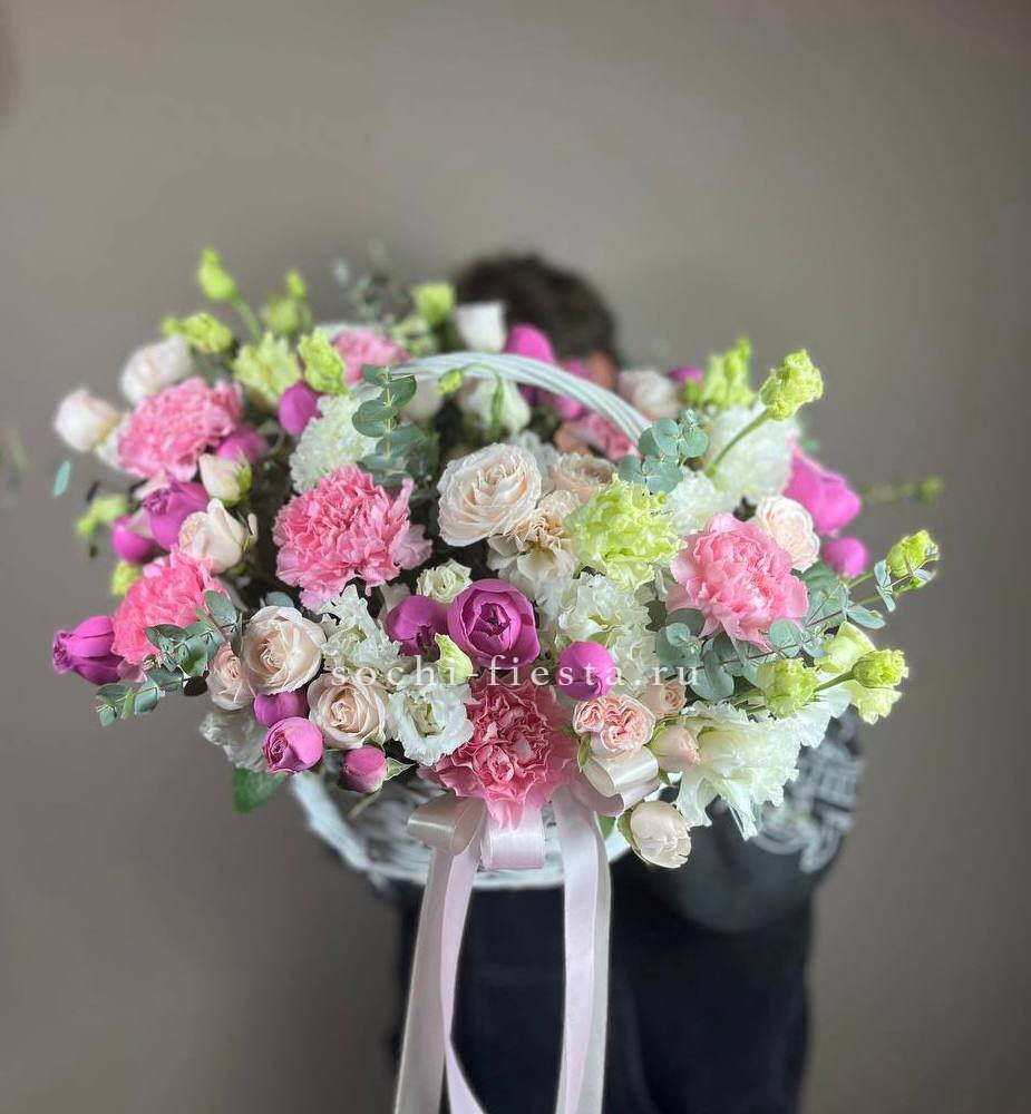 Сорок одна пионовидная роза в светлой корзине выстраивает объёмную композицию с мягкими переливами лилового и розового. Эвкалипт обрамляет густую россыпь бутонов.