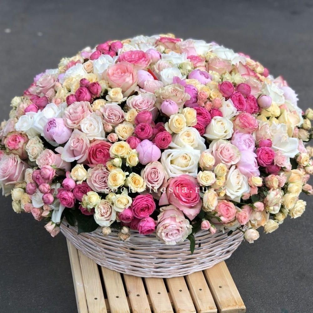 Монументальная композиция из полутора сотен белоснежных бутонов создает впечатление цветочного облака. Корзина придает устойчивость и завершенность форме, позволяя разместить такой масштабный ансамбль в любом пространстве.