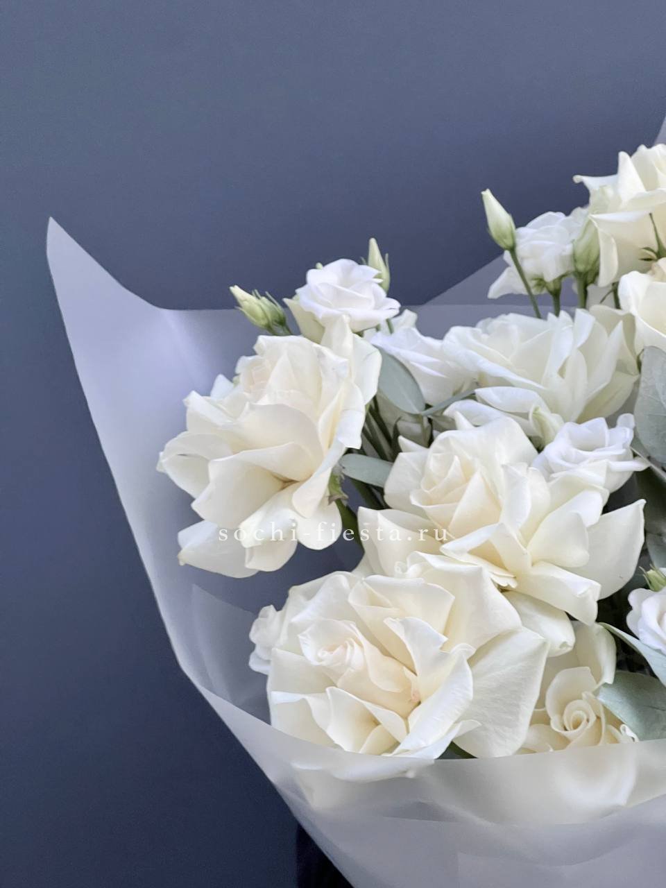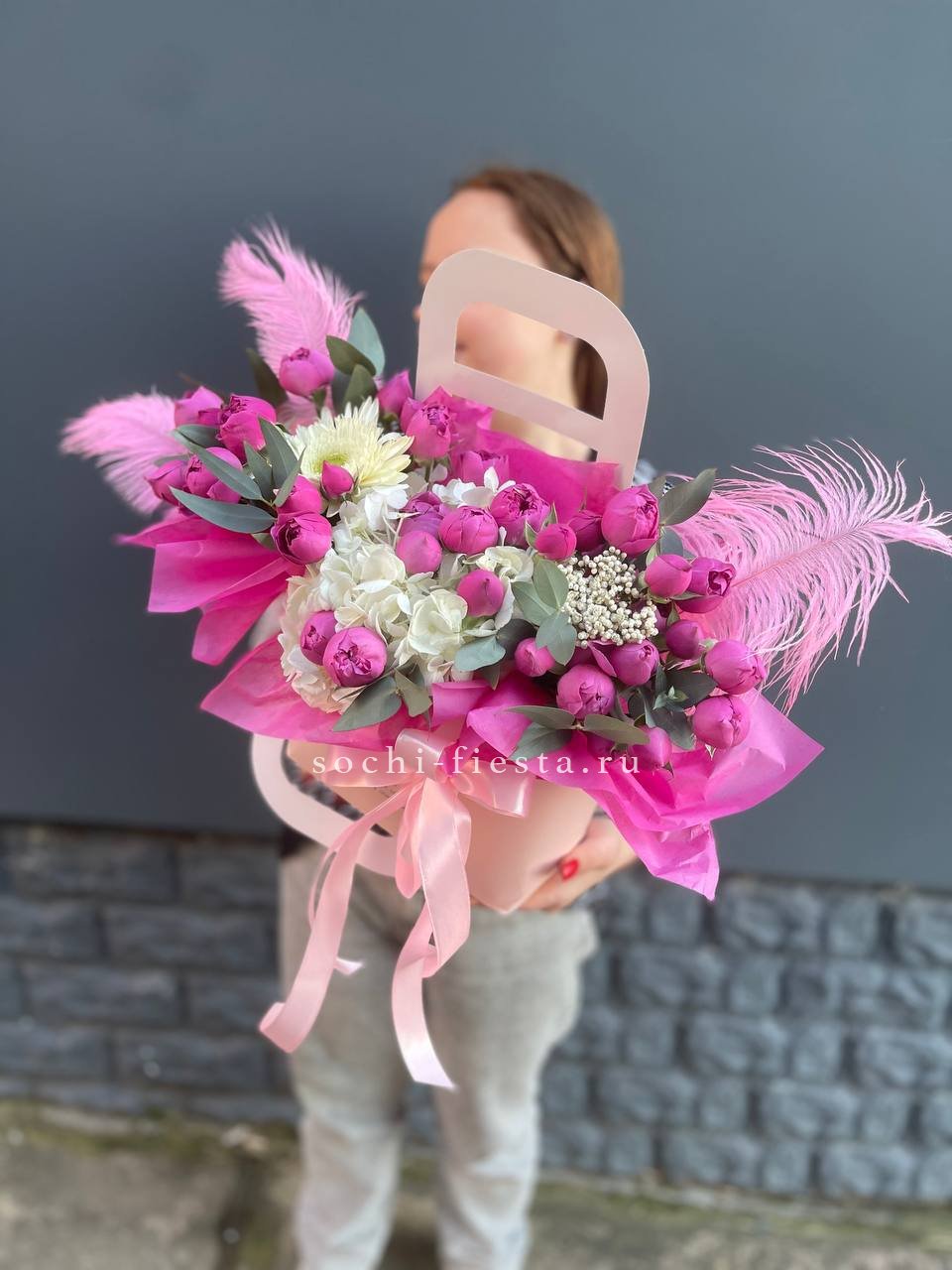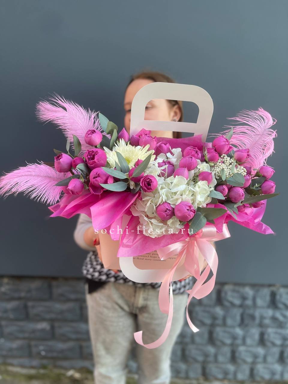 розы, диантусы, пионовидные кустовые розы, гортензия, эвкалипт, вспомогательная зелень, лента, дизайнерская упаковка.