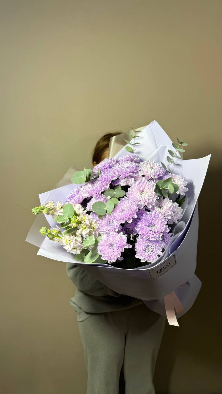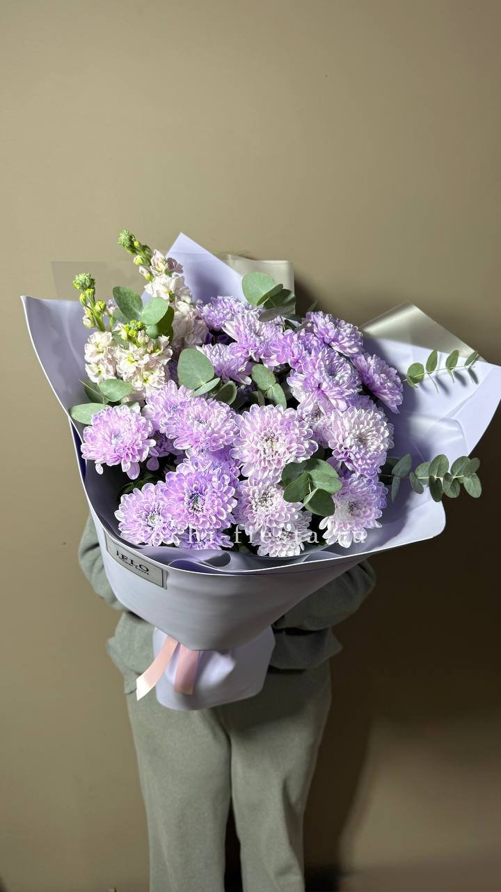 Сине-фиолетовая гамма с переходом в лавандовые и пыльно-розовые оттенки создает глубокую многослойную палитру. Пионовидные формы и воздушная гортензия дают объемную текстуру, а эвкалипт добавляет графичности.