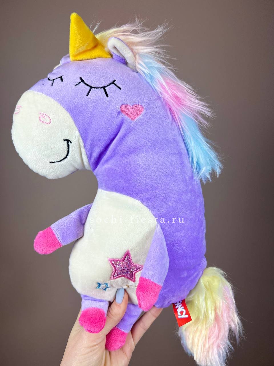 Единорог с радужной гривой притягивает взгляд яркими переходами оттенков. Его вытянутая форма и мягкая фактура делают игрушку приятной на ощупь и запоминающейся.