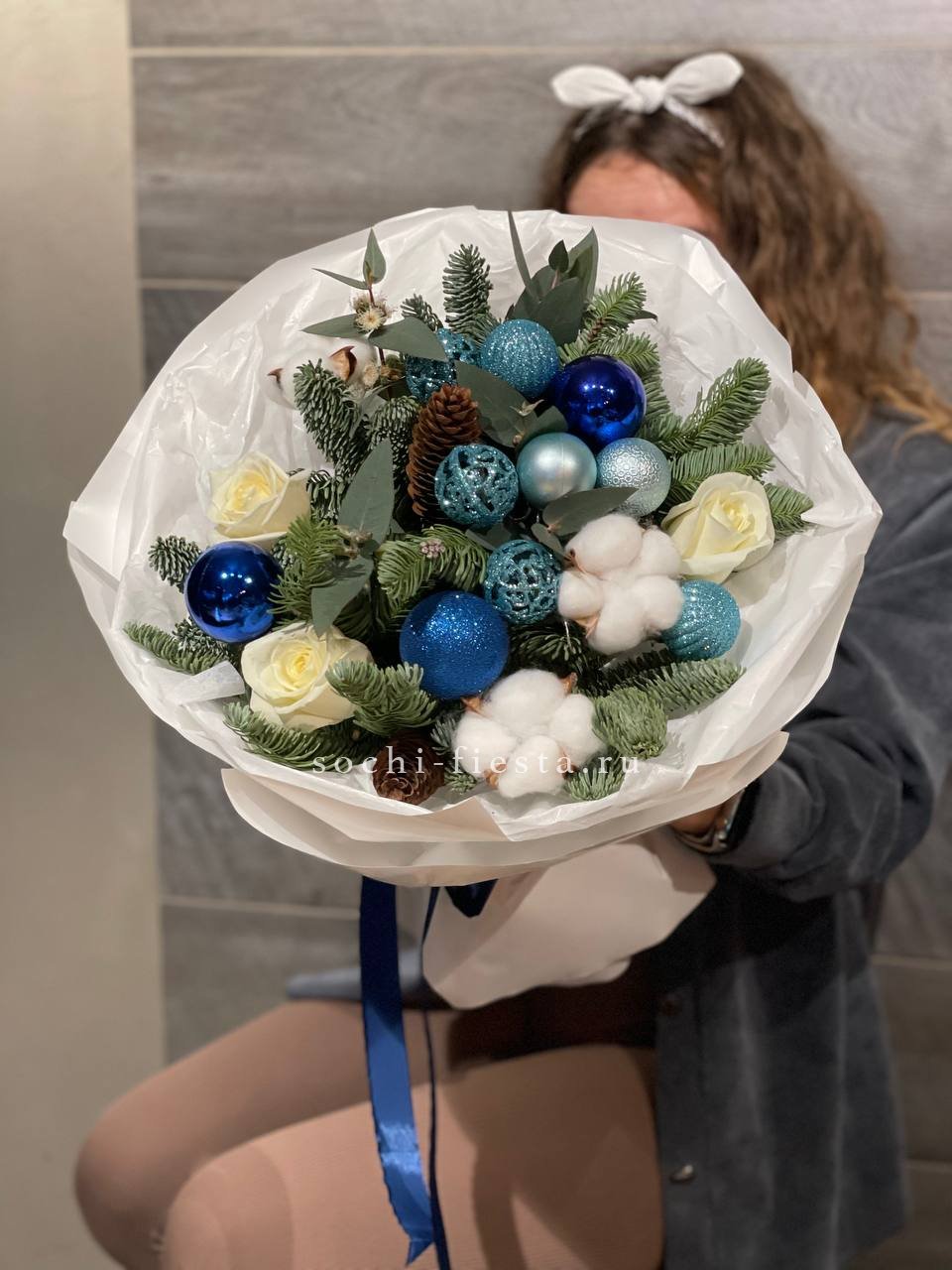 датский нобилис, белые розы 3шт, хлопок, шишки, новогодние игрушки, декор, эвкалипт ВНИМАНИЕ! Готовая композиция (декор) может иметь незначительные внешние отличия от примера на фотографии.