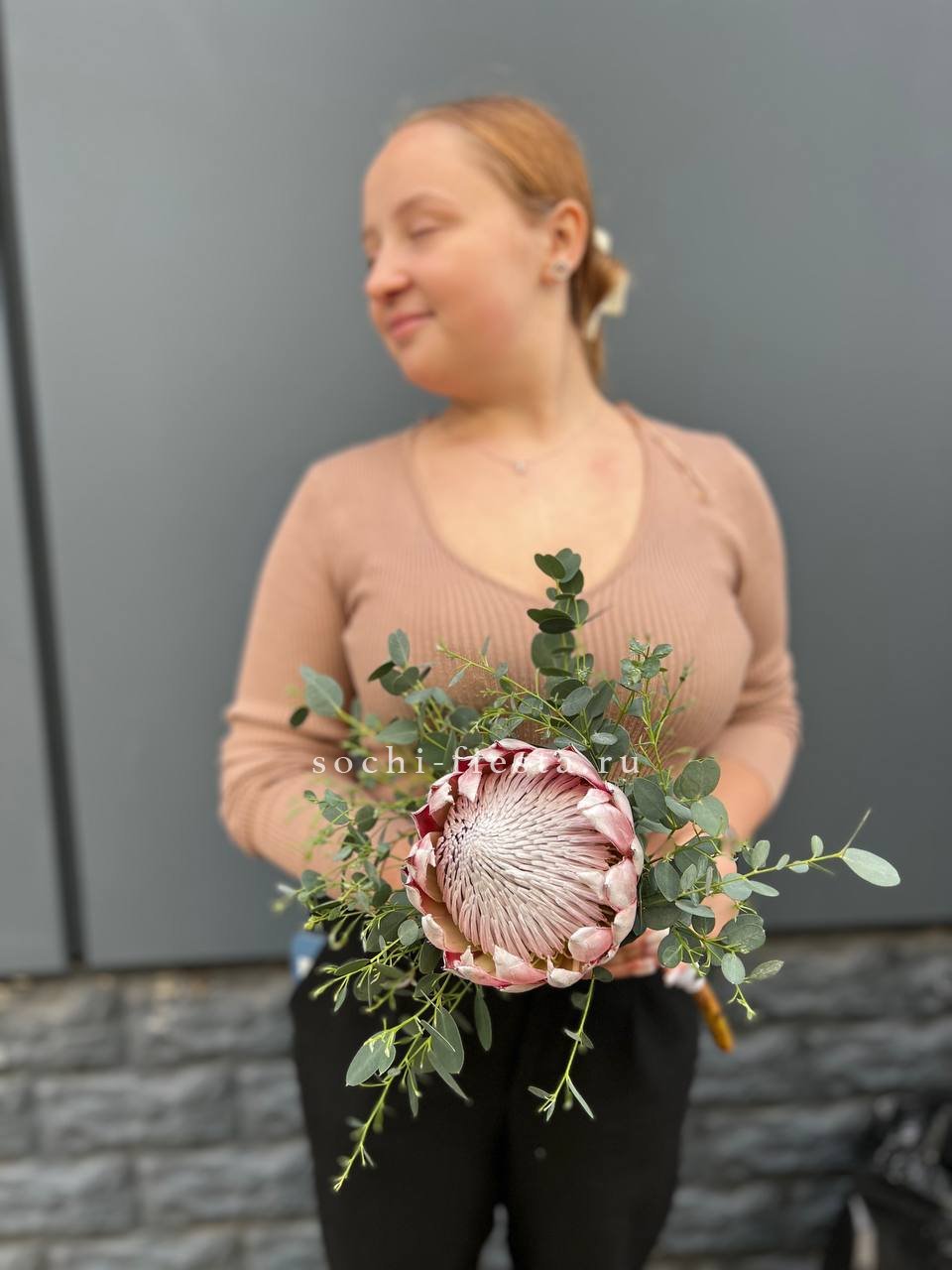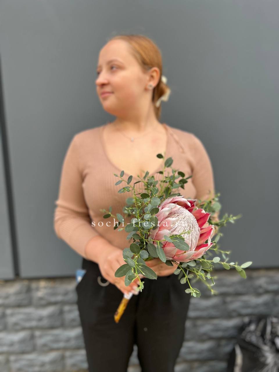 кустовые пионовидные розы Бомбастик, одноголовая пионовидная роза (или замена вне сезона на кустовую пионовидную), диантусы, эвкалипт, лента.