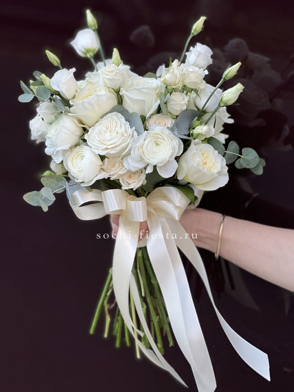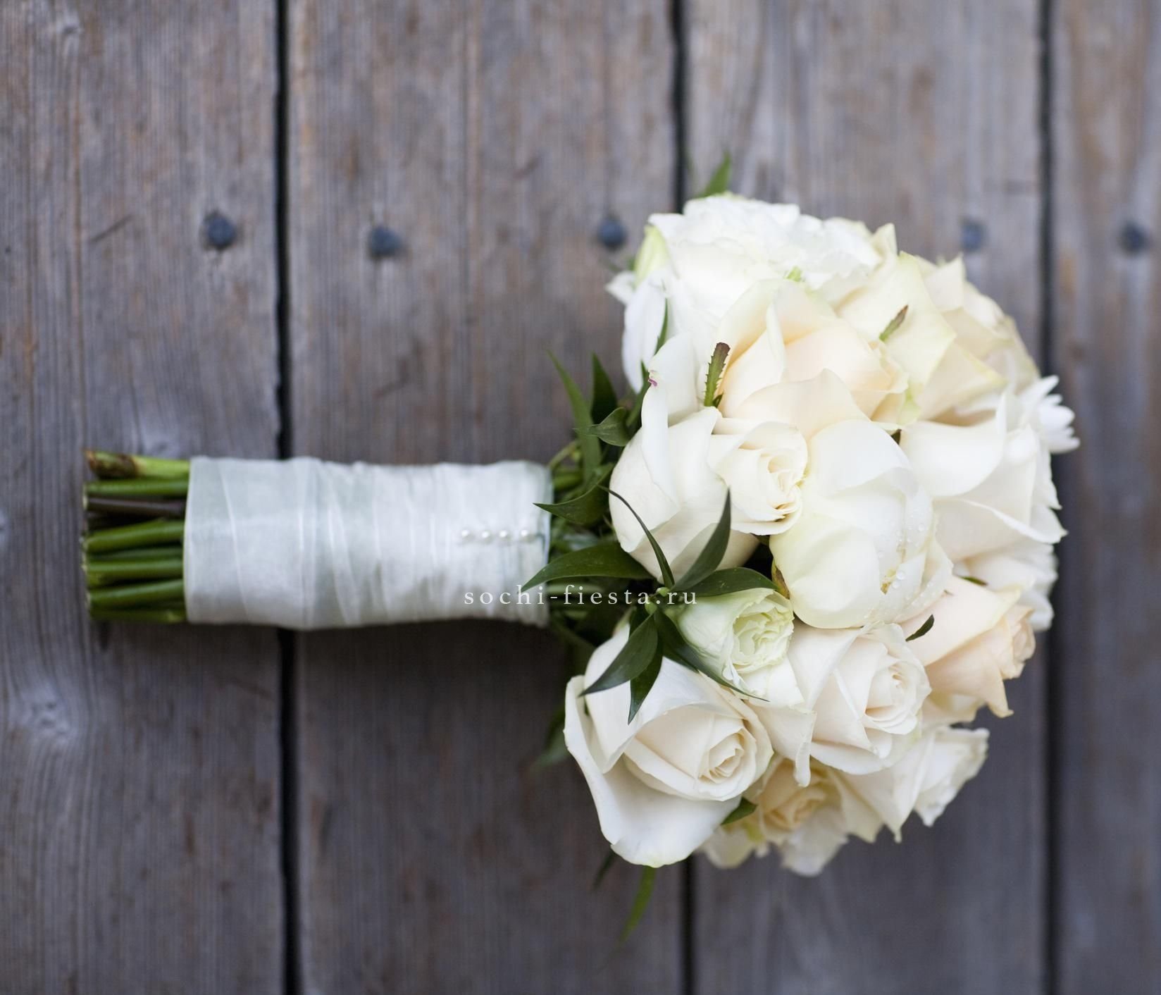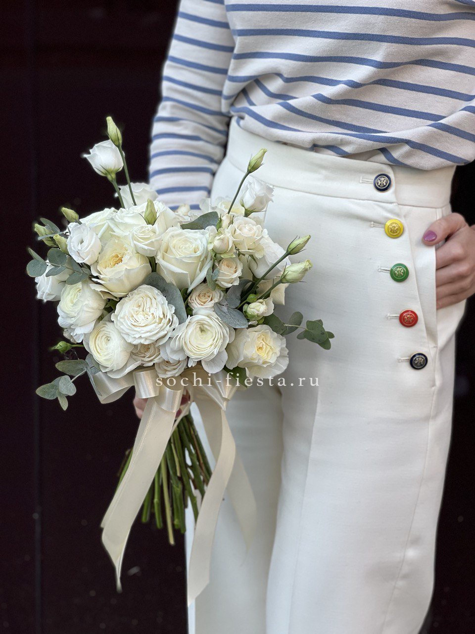 Воздушная сферическая форма с плотной укладкой кремовых и белых бутонов. Пионовидные розы Бомбастик создают объемную текстуру, а диантусы добавляют детали по всей композиции.