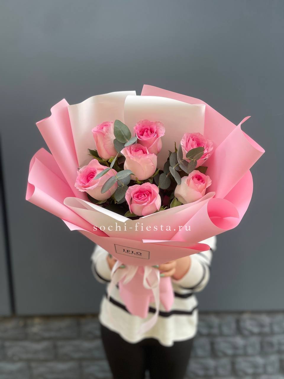 Семь пионовидных роз образуют компактный букет с мягкими линиями и спокойным ритмом. Ветви эвкалипта добавляют воздушности и завершают композицию.