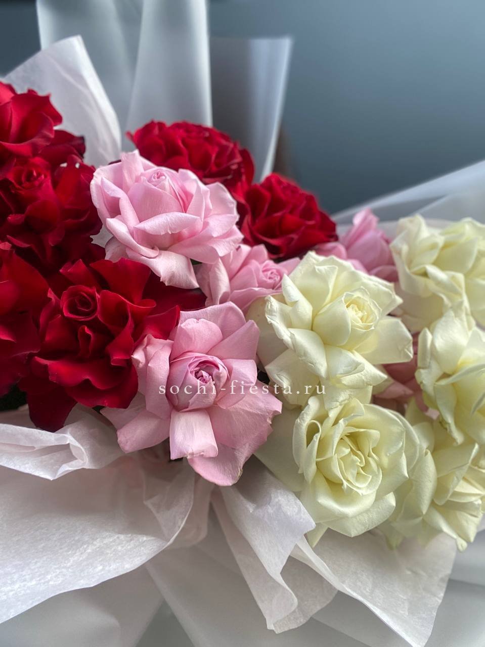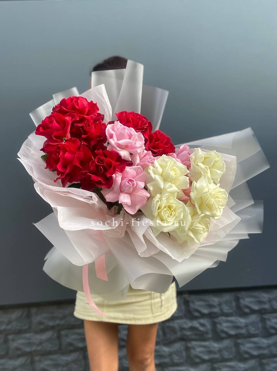 Длинные стебли и крупные бутоны в палитре микс создают букет с графичным силуэтом. Сто одна роза выстраивается в плотную композицию с выразительной вертикалью.