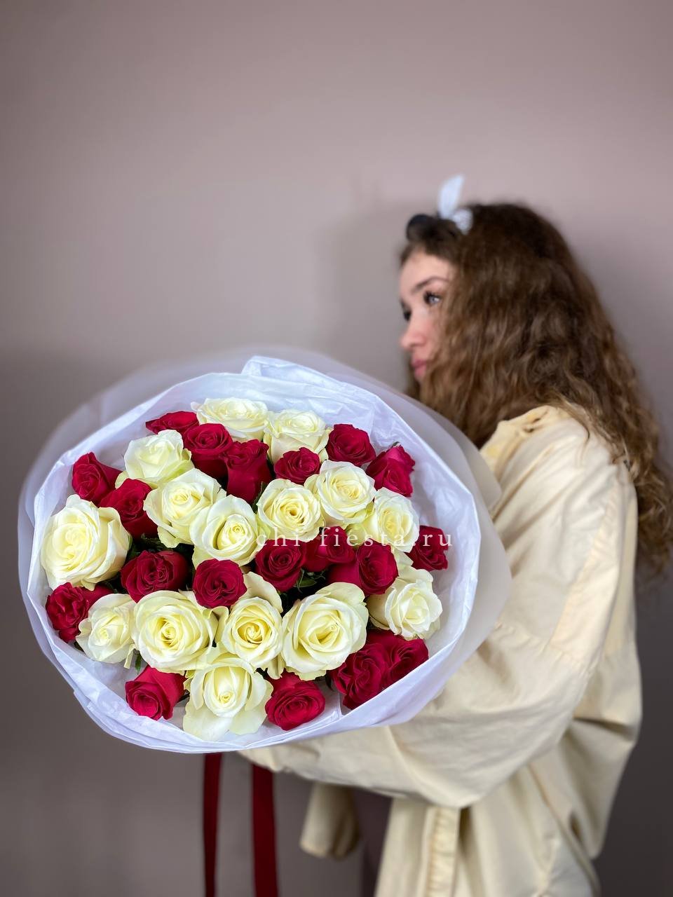 в составе 35 красно-белых роз.