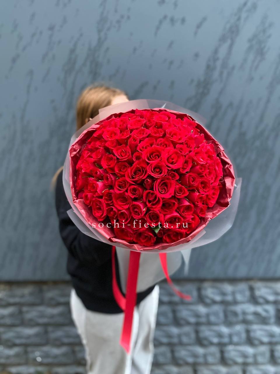 Сто один бутон в бело-розовой палитре создают объёмное облако цвета. Композиция впечатляет масштабом и наполняет пространство мягким сиянием лепестков.