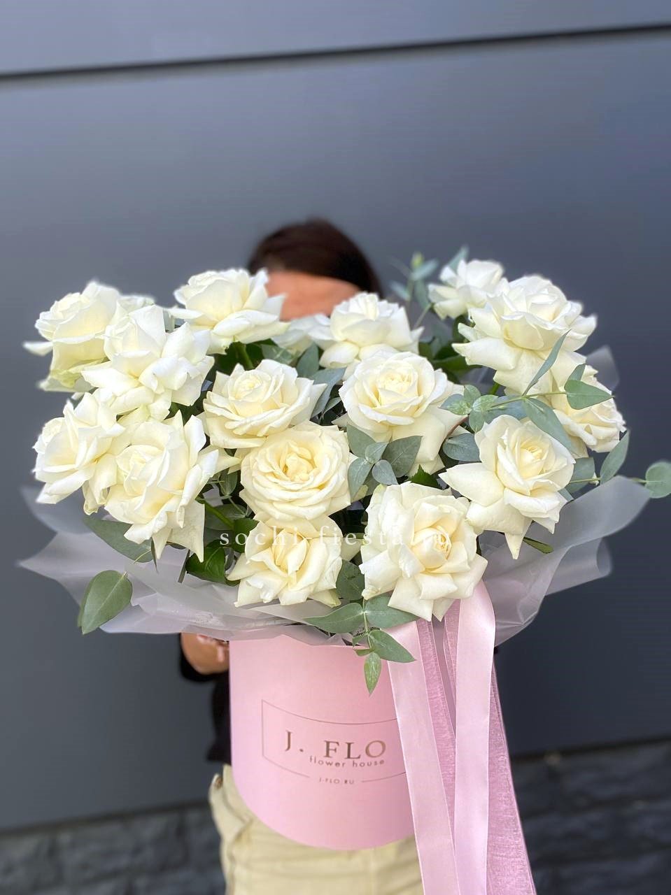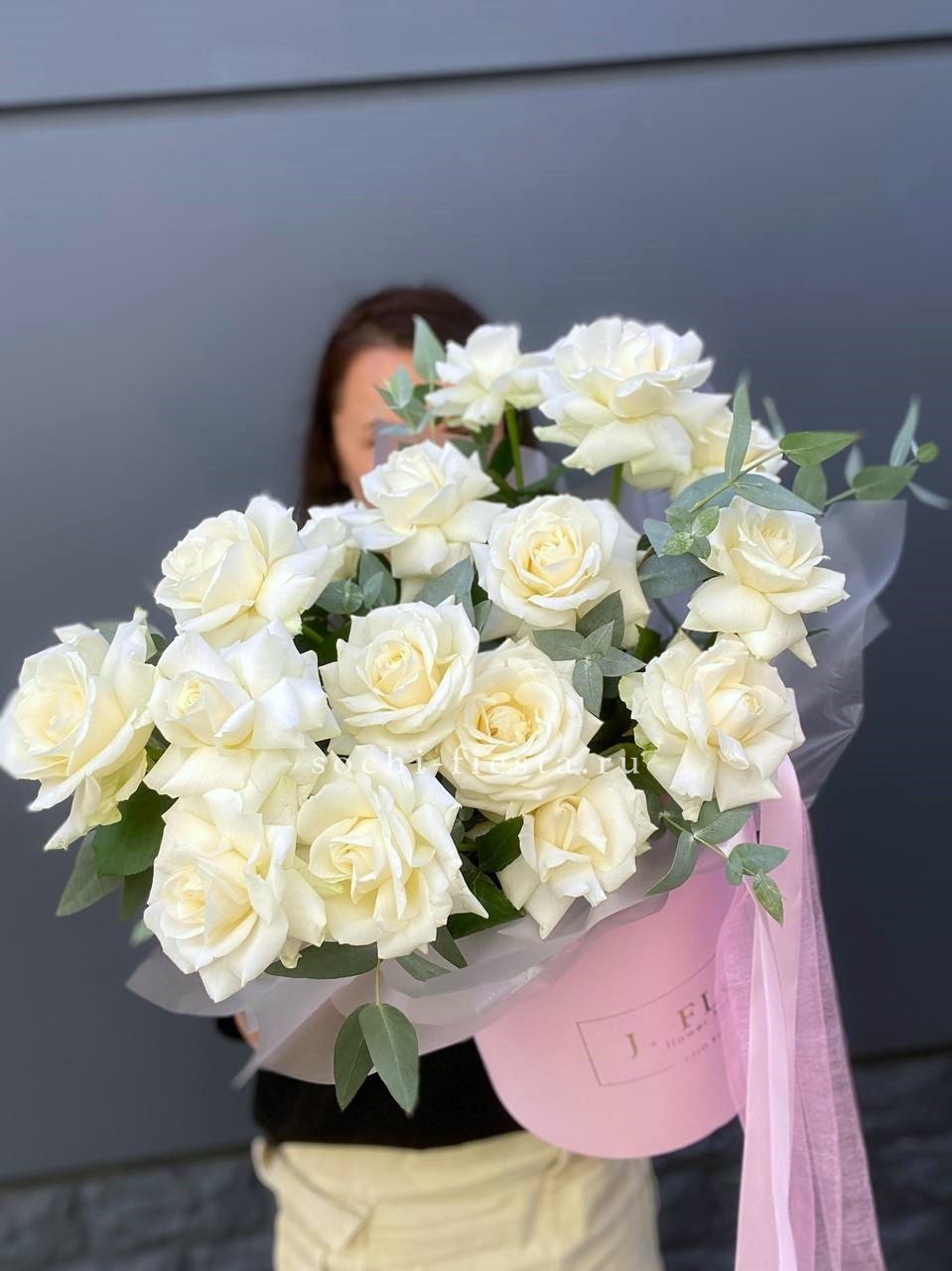Пятнадцать белых роз в упаковке кофейного оттенка создают спокойное сочетание света и теплой глубины. Лаконичная форма букета удобна для вручения и дальнейшего размещения.