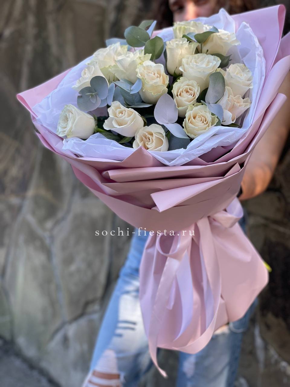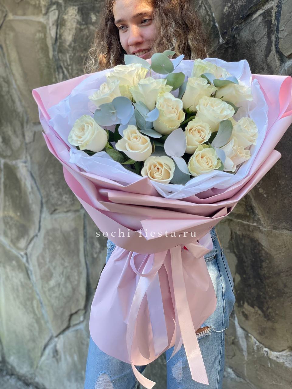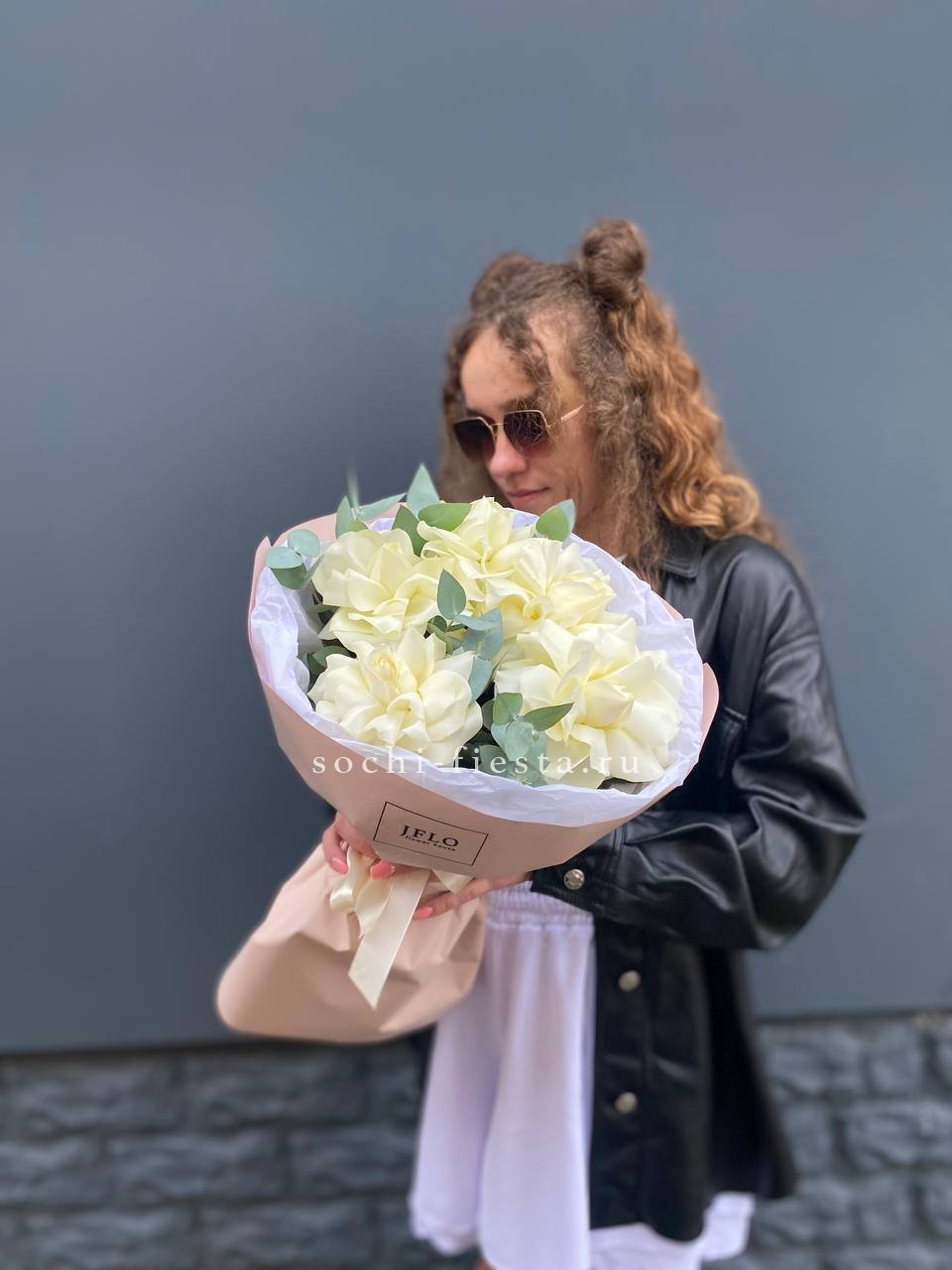 Тридцать семь белых французских роз собраны в круглый бокс с ветками эвкалипта. Плотная укладка бутонов создает объемную композицию, где каждый цветок виден и держит форму. Безупречное решение для яркого события.