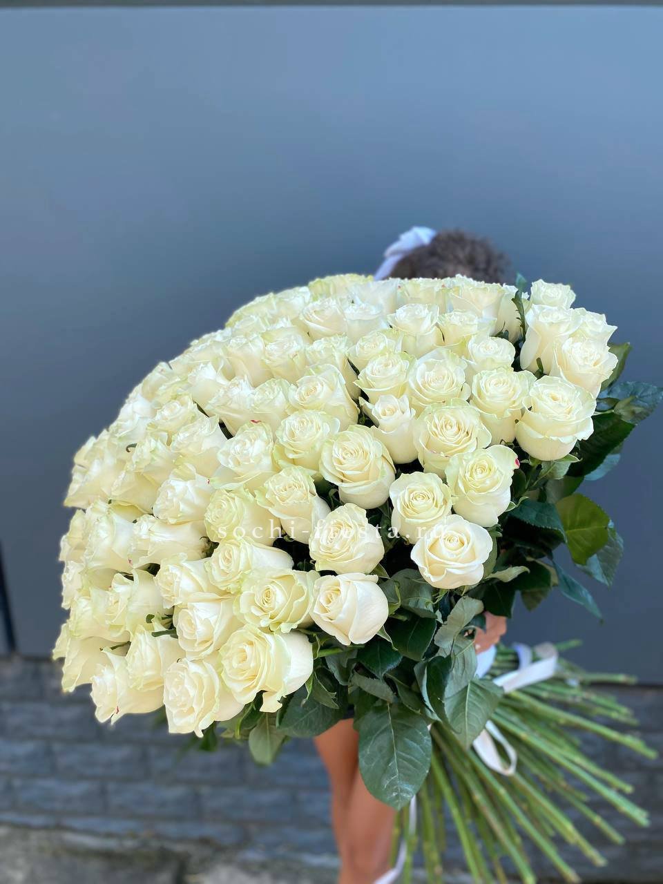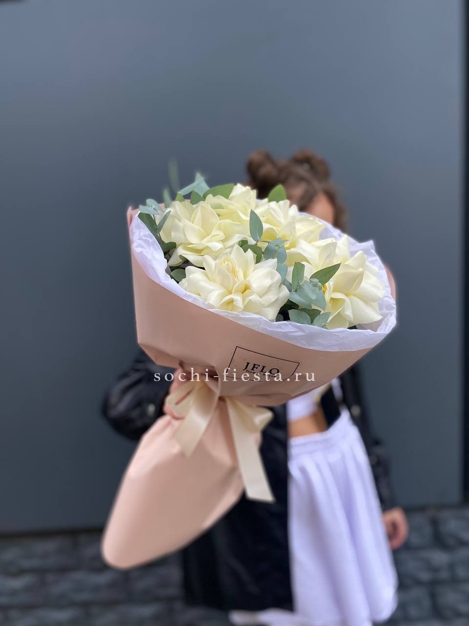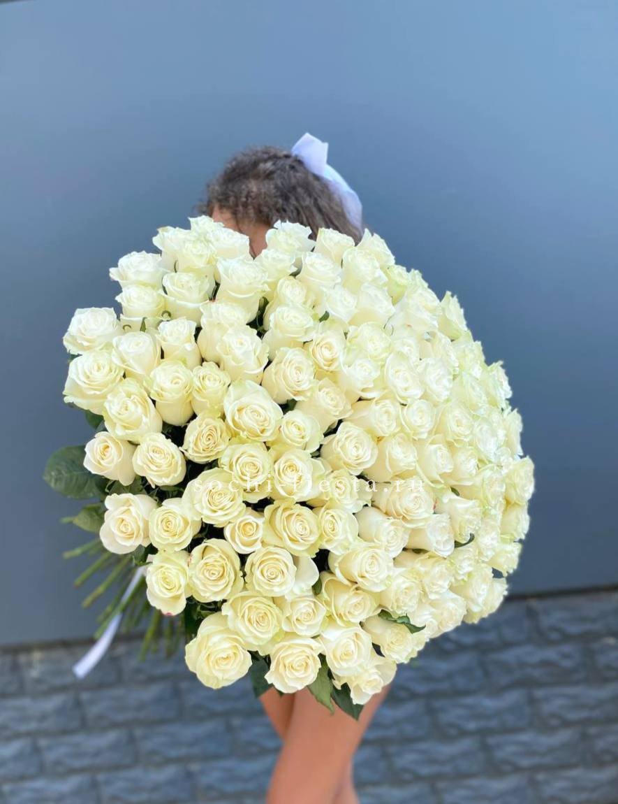 Тридцать семь белых французских роз собраны в круглый бокс с ветками эвкалипта. Плотная укладка бутонов создает объемную композицию, где каждый цветок виден и держит форму. Безупречное решение для яркого события.