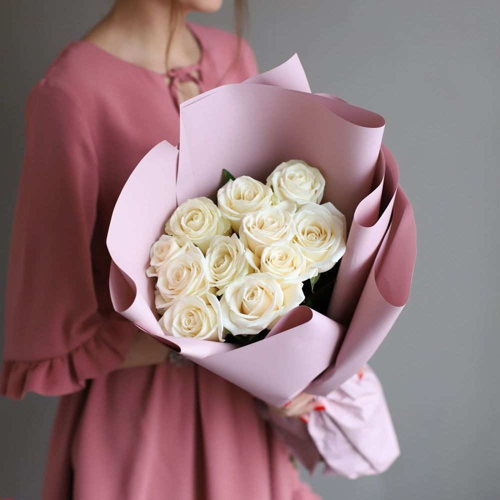 Пятнадцать белоснежных роз собраны в аккуратную форму с ровным силуэтом. Композиция сохраняет свежесть и держит структуру благодаря продуманному размещению бутонов в цилиндре.