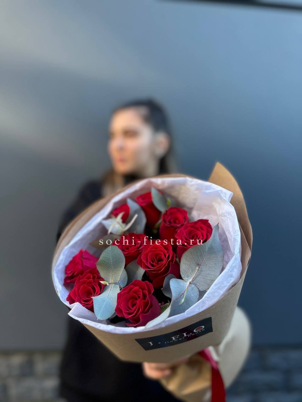 Девять красных бутонов в обрамлении свежего эвкалипта и крафтовой обёртки. Лаконичная сборка для тех, кто ценит простоту и выразительность цвета без лишних деталей.