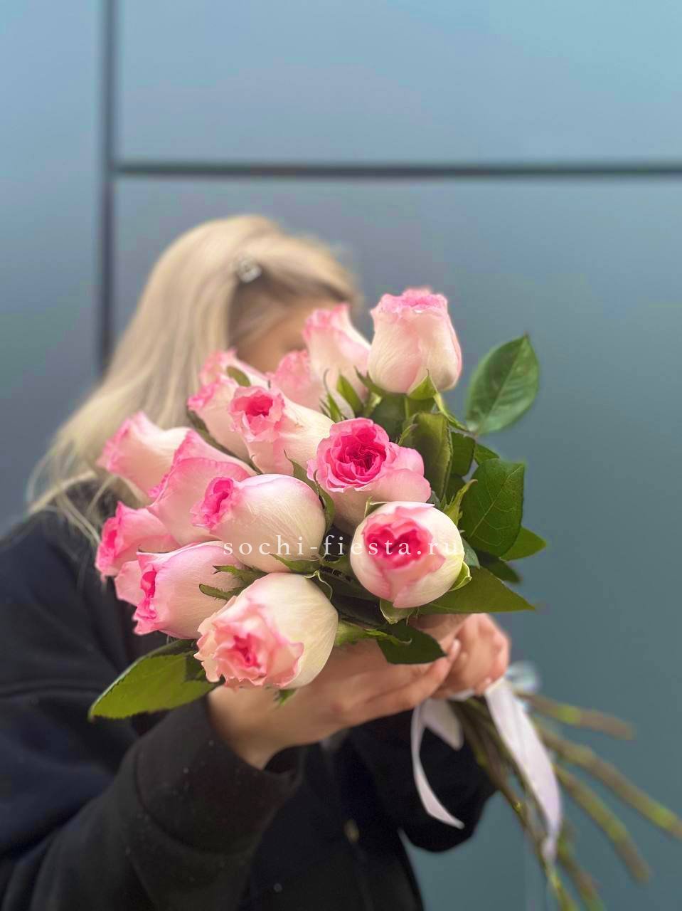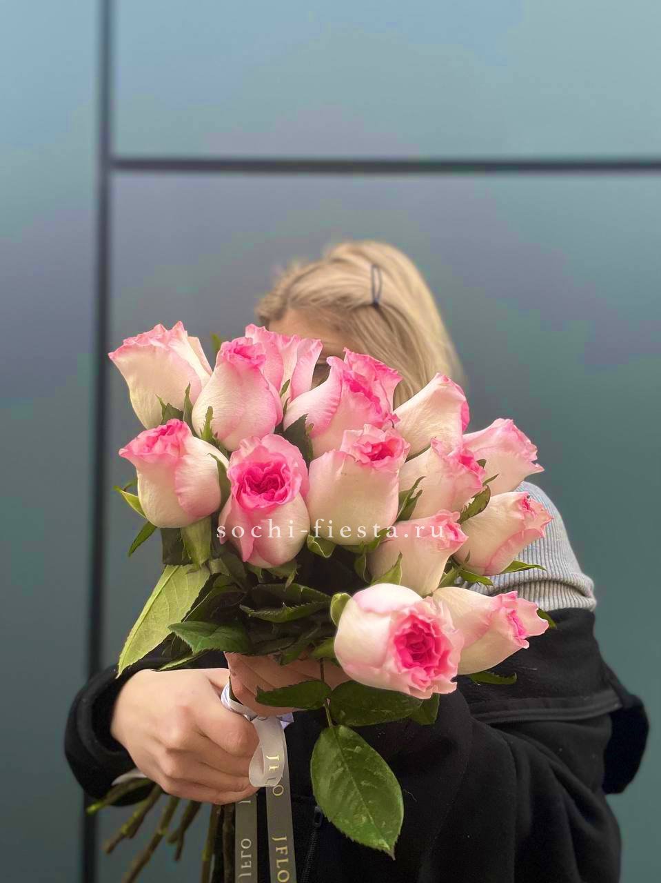 21 розовые розы, лента, дизайнерское оформление.