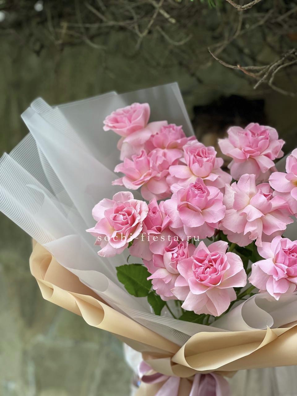Пятнадцать французских роз Pink Dream с характерно вывернутыми лепестками. Фактура бутонов открывает глубину цвета и добавляет объем всей композиции.