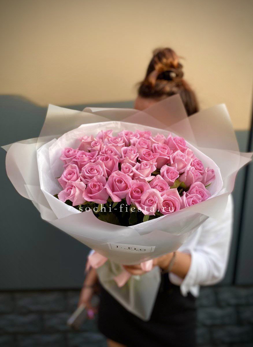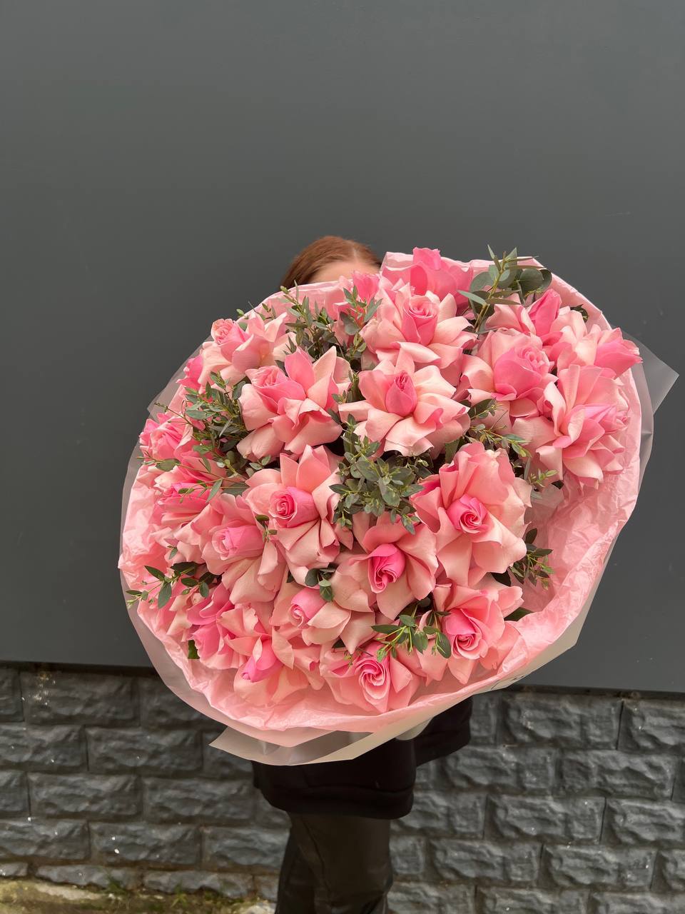 Двадцать одна роза в оригинальной упаковке с игривыми ушками создает настроение легкости и свежести. Розовые бутоны собраны в аккуратную композицию, которая удерживает форму и выглядит выразительно в любом интерьере.