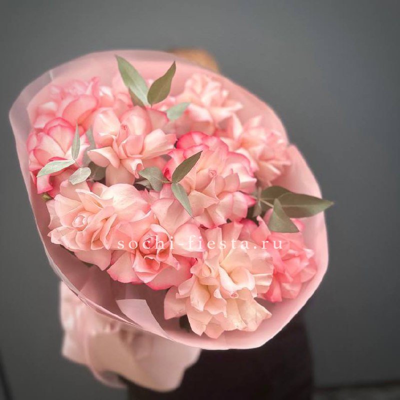 французские розы - 11 шт., эвкалипт - 1шт., лента, авторская упаковка.