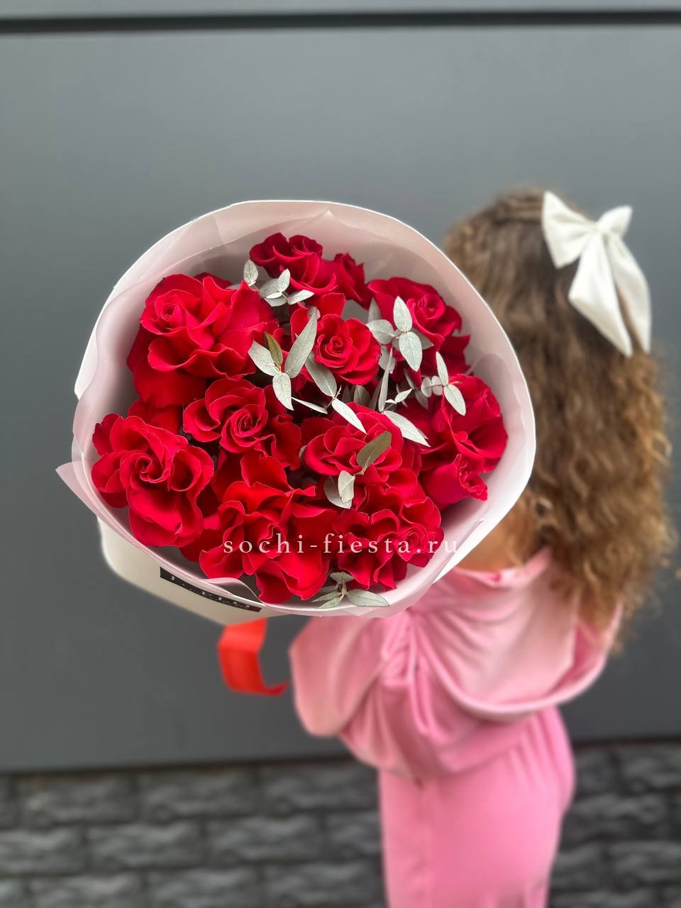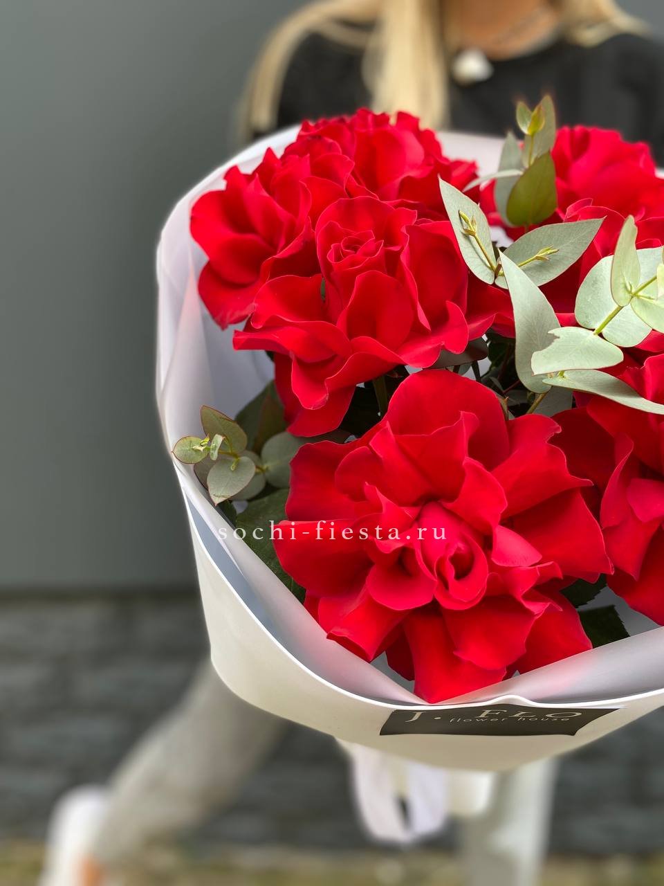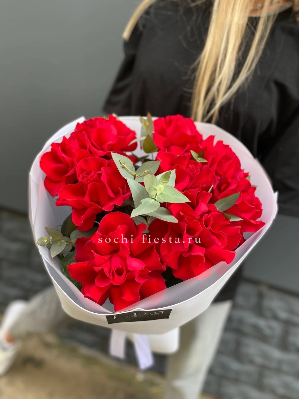 Одиннадцать французских роз с вывернутыми лепестками раскрывают всю глубину бутона. Насыщенный красный цвет и графичная форма создают яркое присутствие.