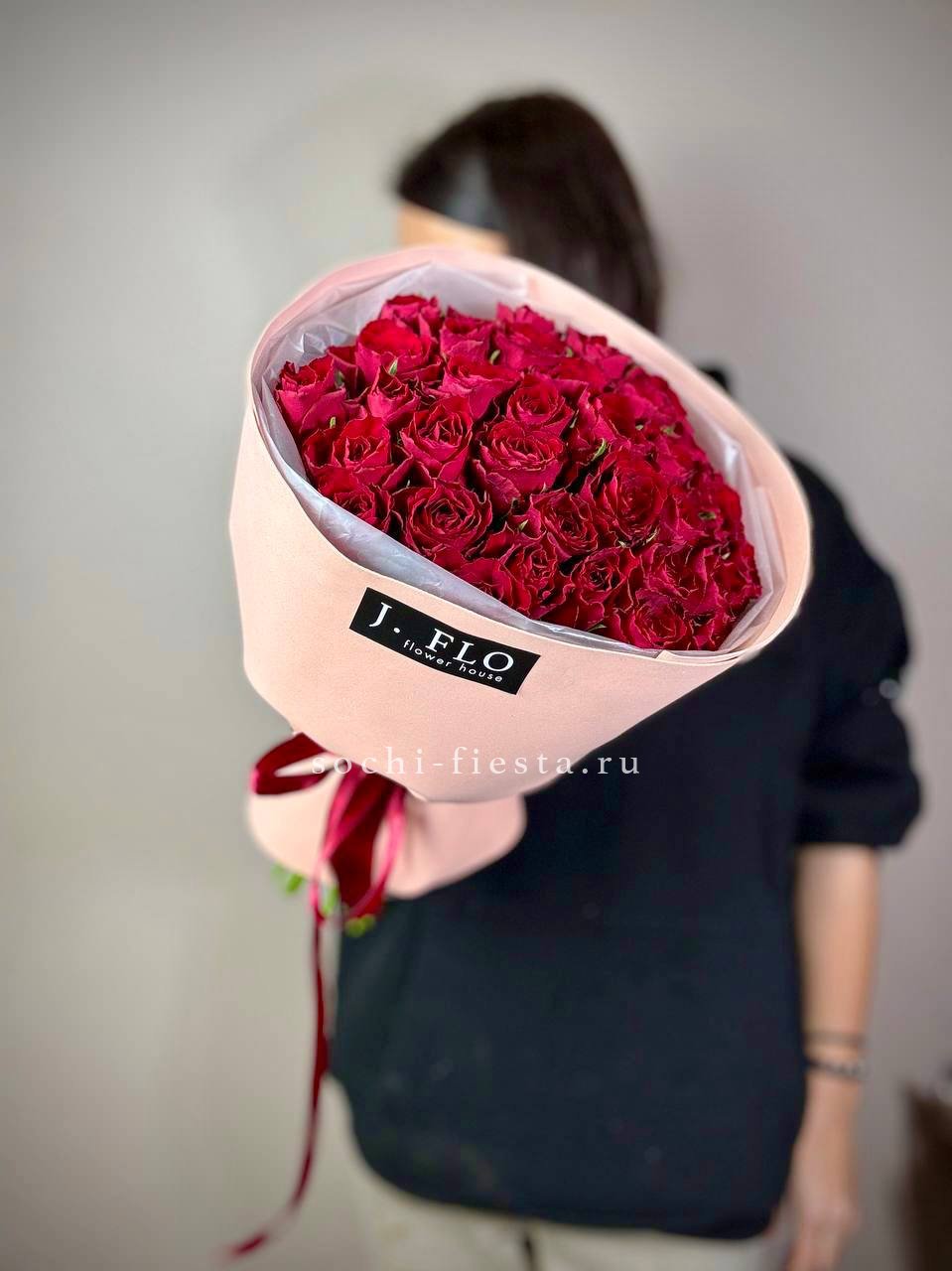 Сто одна красная роза хорошо сохраняет форму и долго радует свежестью бутонов. Плотная сборка обеспечивает аккуратный вид и удобство размещения в любом интерьере.