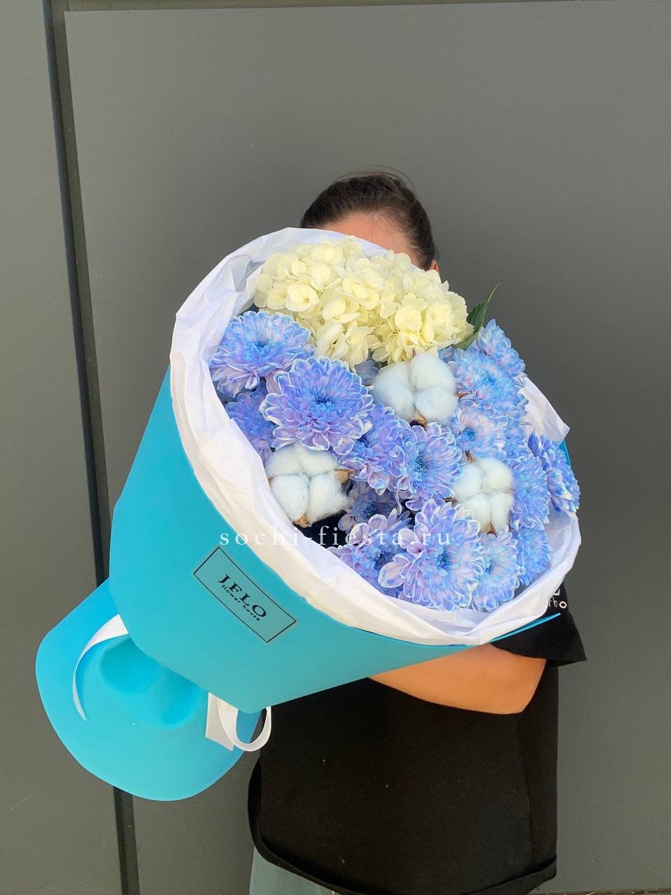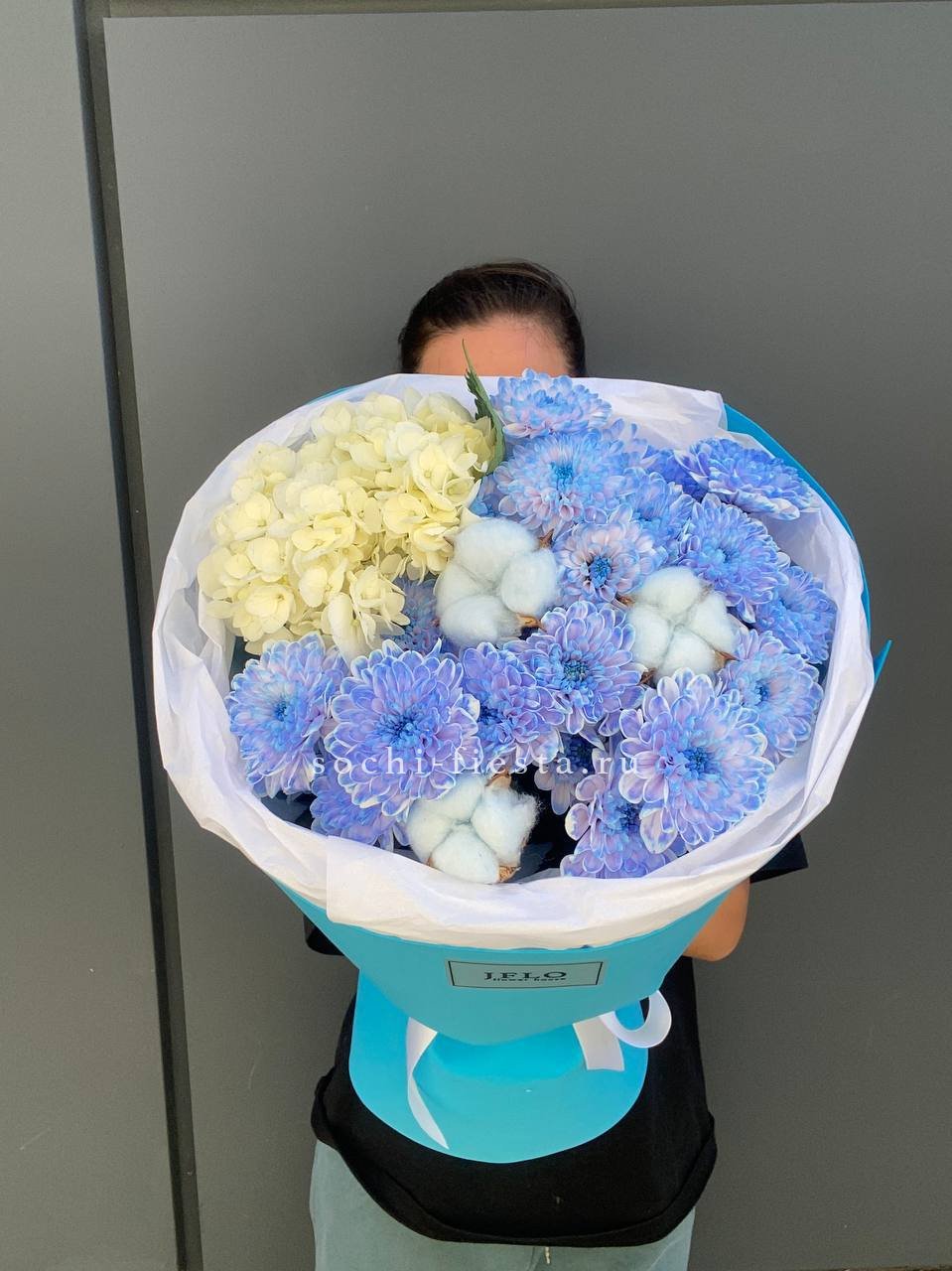 гортензия, розовые розы, диантусы, эустома, маттиолы, эвкалипт лента и дизайнерская пленка.