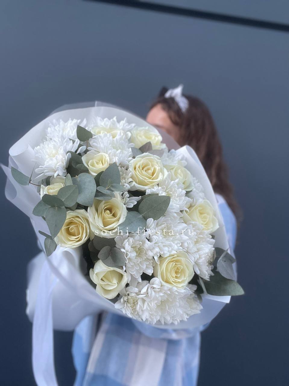 хризантема кустовая, белые розы, эвкалипт, лента, дизайнерская пленка.