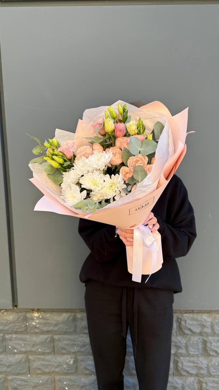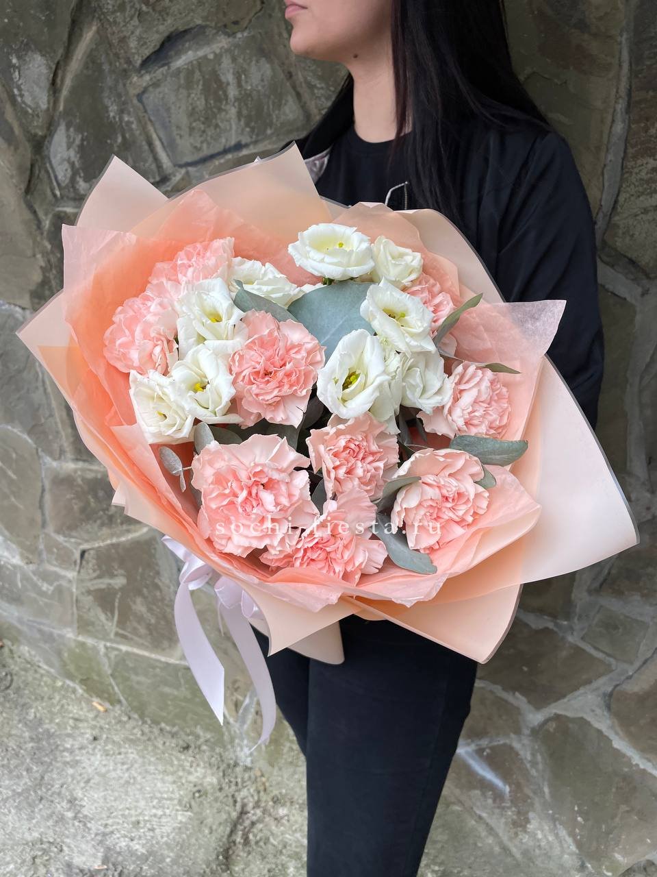 Воздушные диантусы персикового оттенка раскрываются пышными шапками среди нежной эустомы. Ветви эвкалипта придают букету свежесть и легкую графичность.