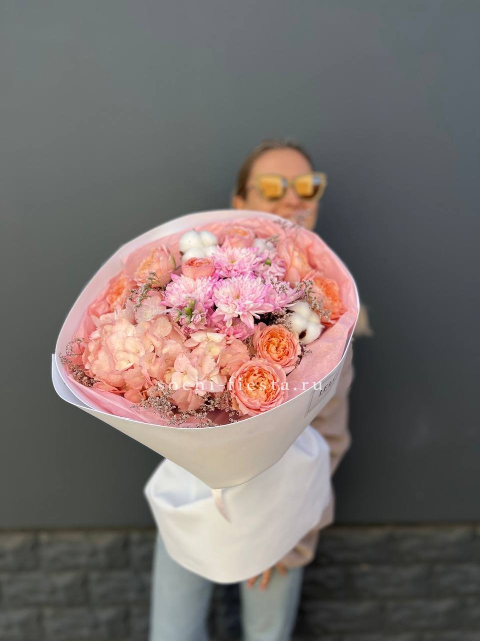 Пионовидные розы Джульетта с пышными шапками гортензии создают плотную композицию в пудровой гамме. Хлопок и лимониум добавляют воздушности, а кустовая хризантема заполняет пространство между крупными бутонами. Букет держит форму и долго сохраняет свежесть.