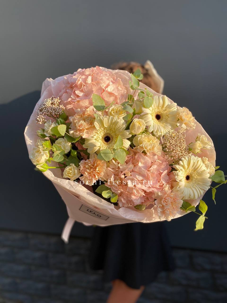 гортензия, роза белая, диантус лента, дизайнерская пленка.