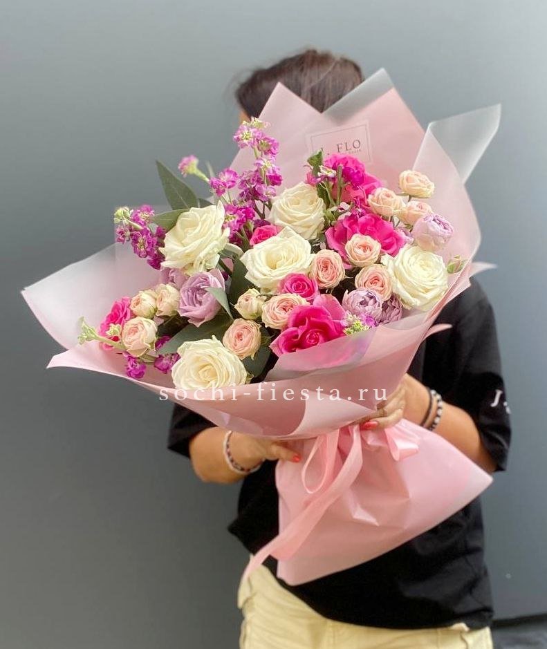 розы, кустовые розы Мисти Баблс, бомбастик, маттиола (или аналог вне сезона),  лента, дизайнерская пленка.