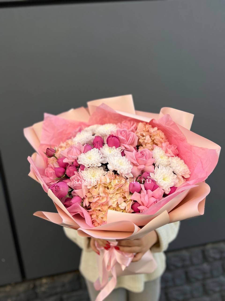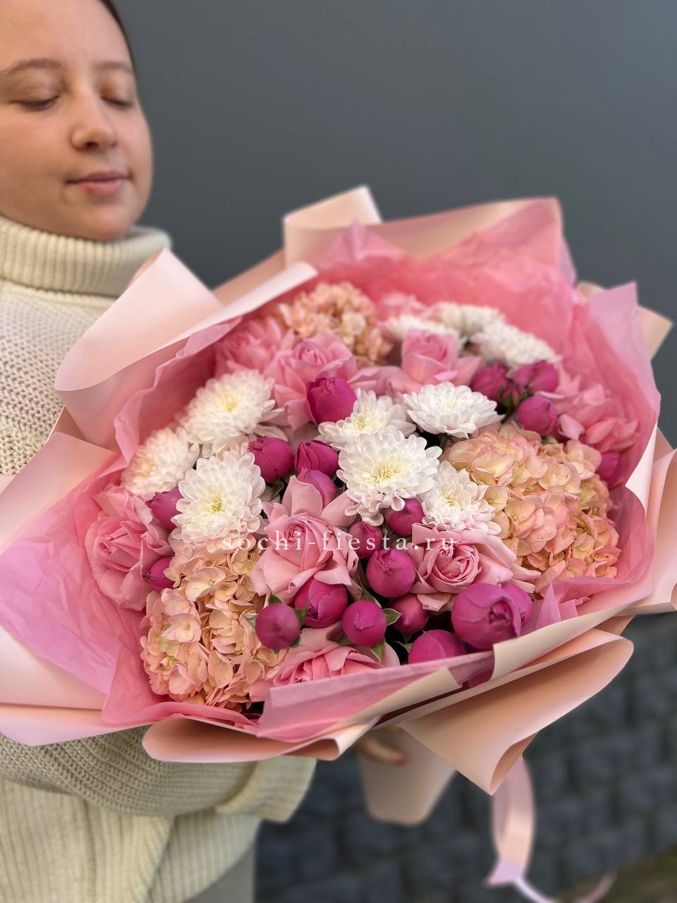 Французские розы и кустовые хризантемы собраны в букет с плотной текстурой и мягким переходом оттенков. Композиция держит форму и долго сохраняет свежесть.