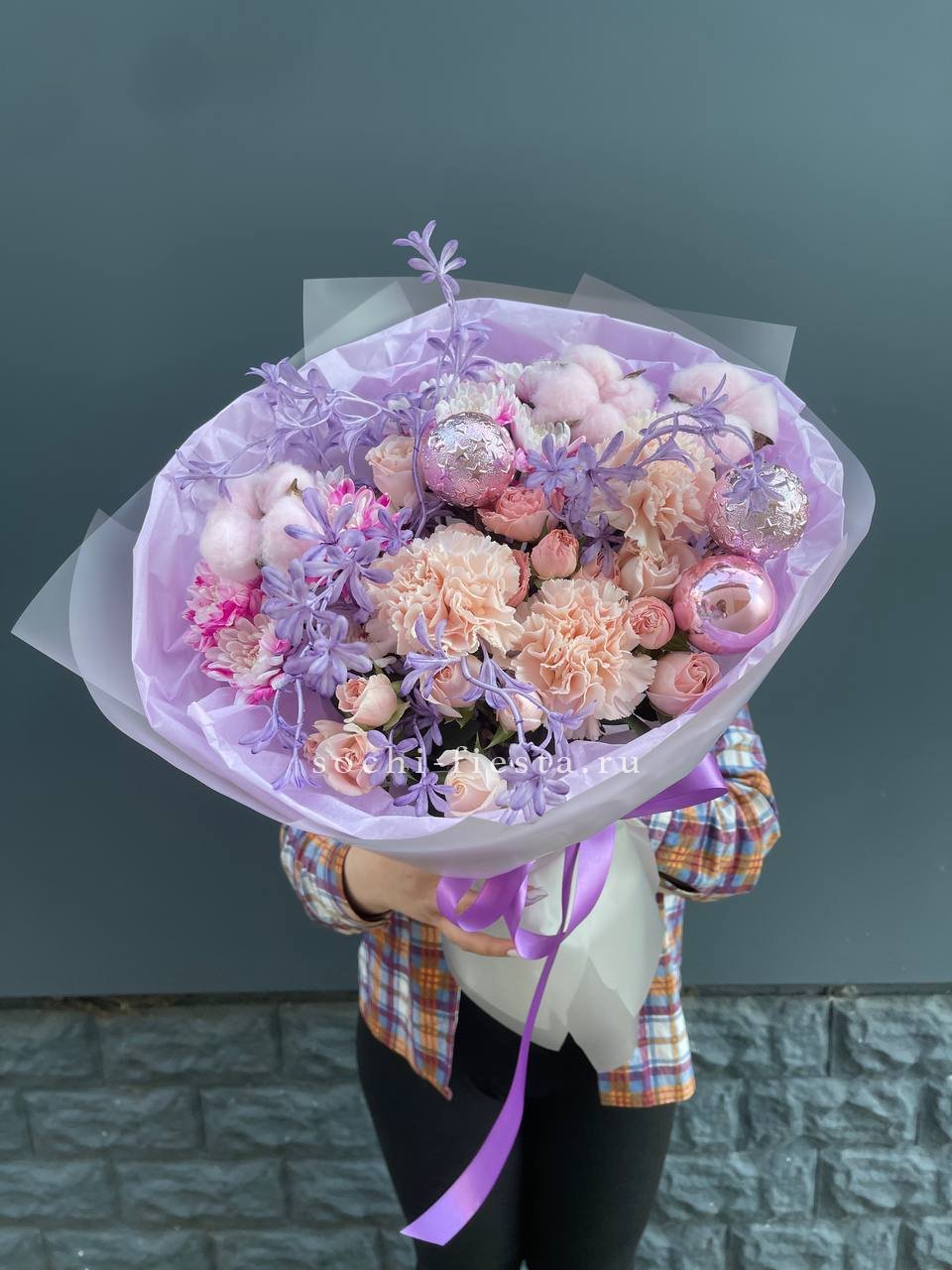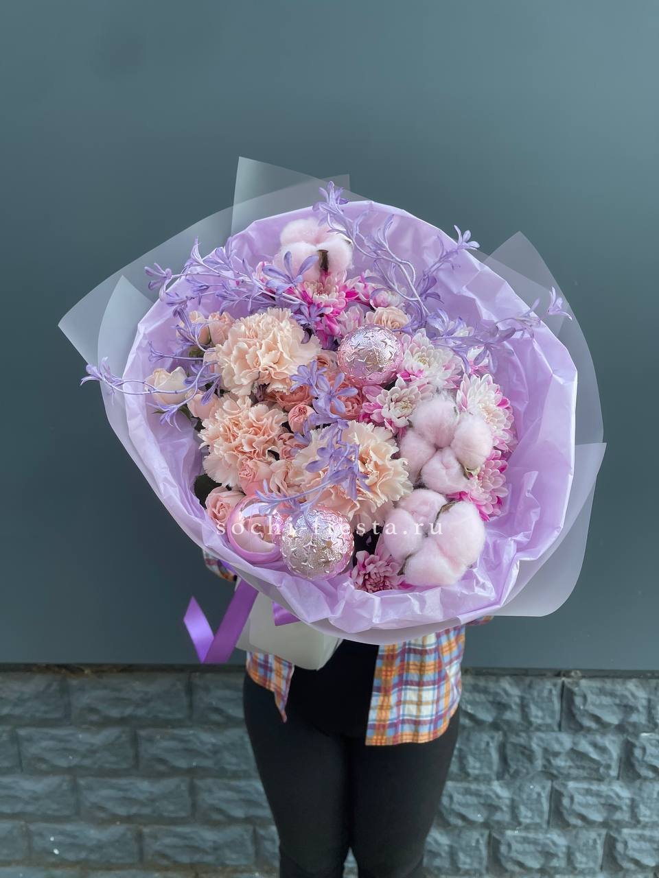 Сиреневые хризантемы и диантус выстраиваются в плотную композицию с новогодним декором. Бомбастик и хлопок создают фактурные переходы между цветами. Букет наполнен праздничным духом и зимней свежестью.