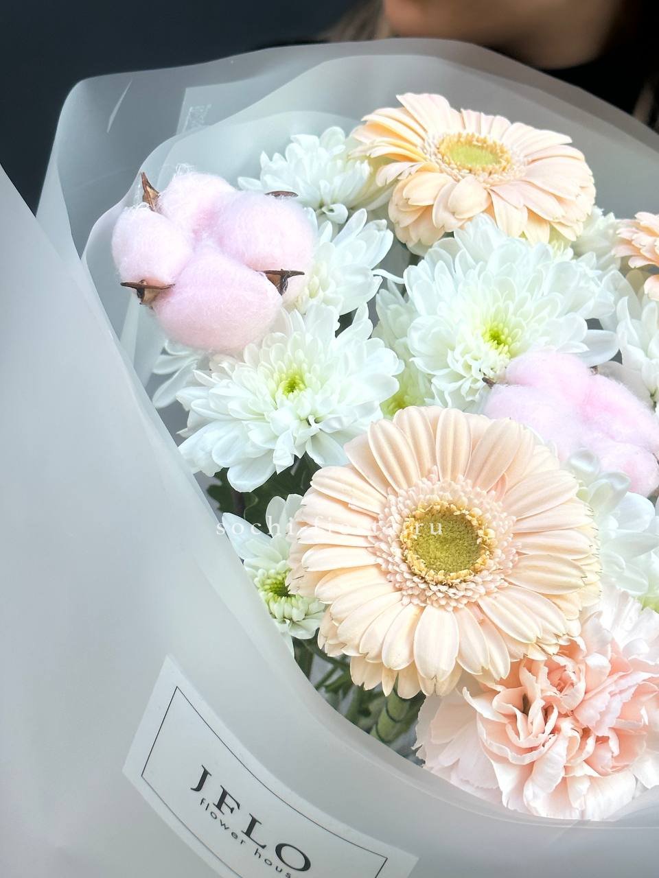 герберы, хлопок, эустома, хризантемы,  авторское оформление.