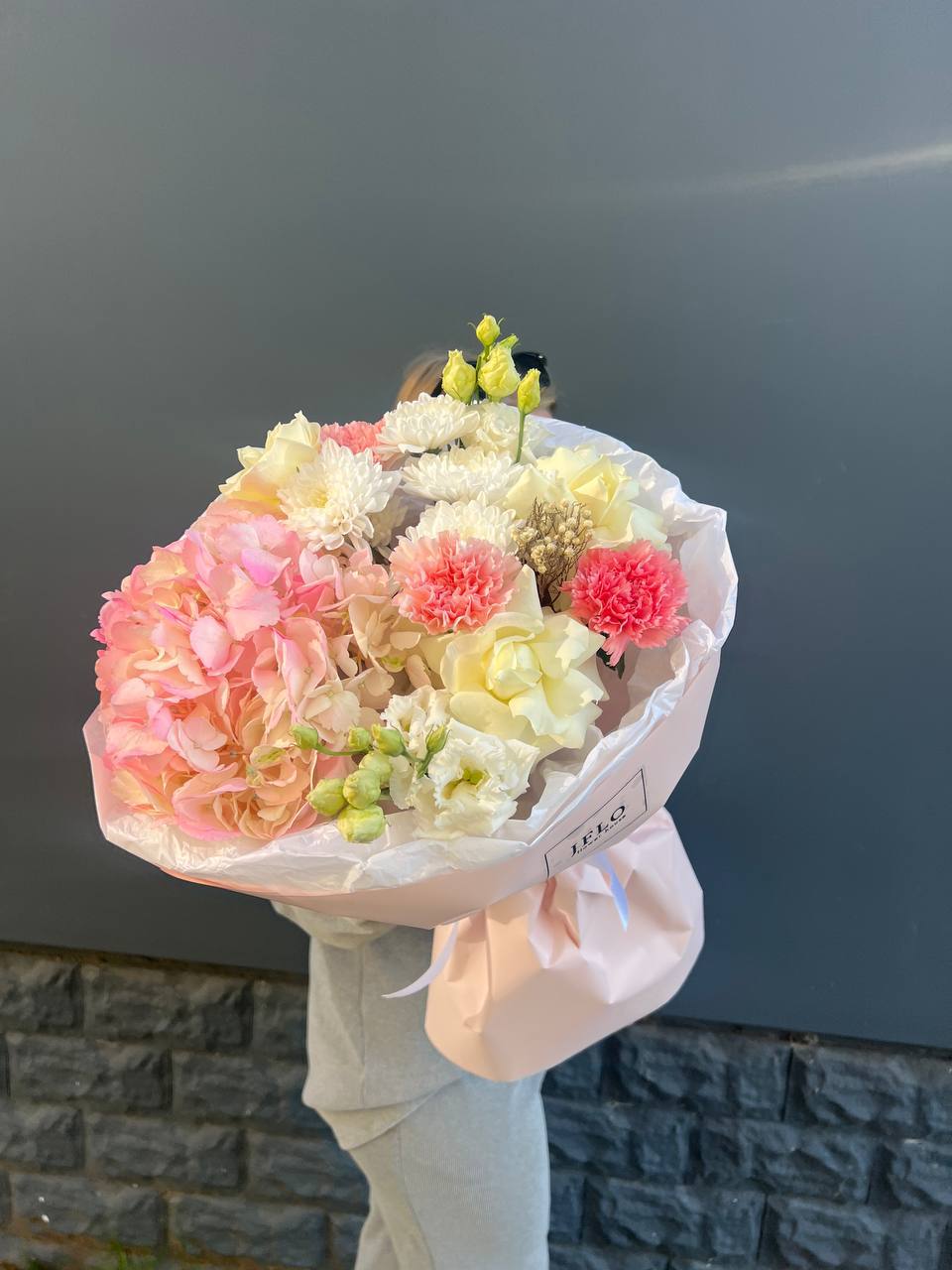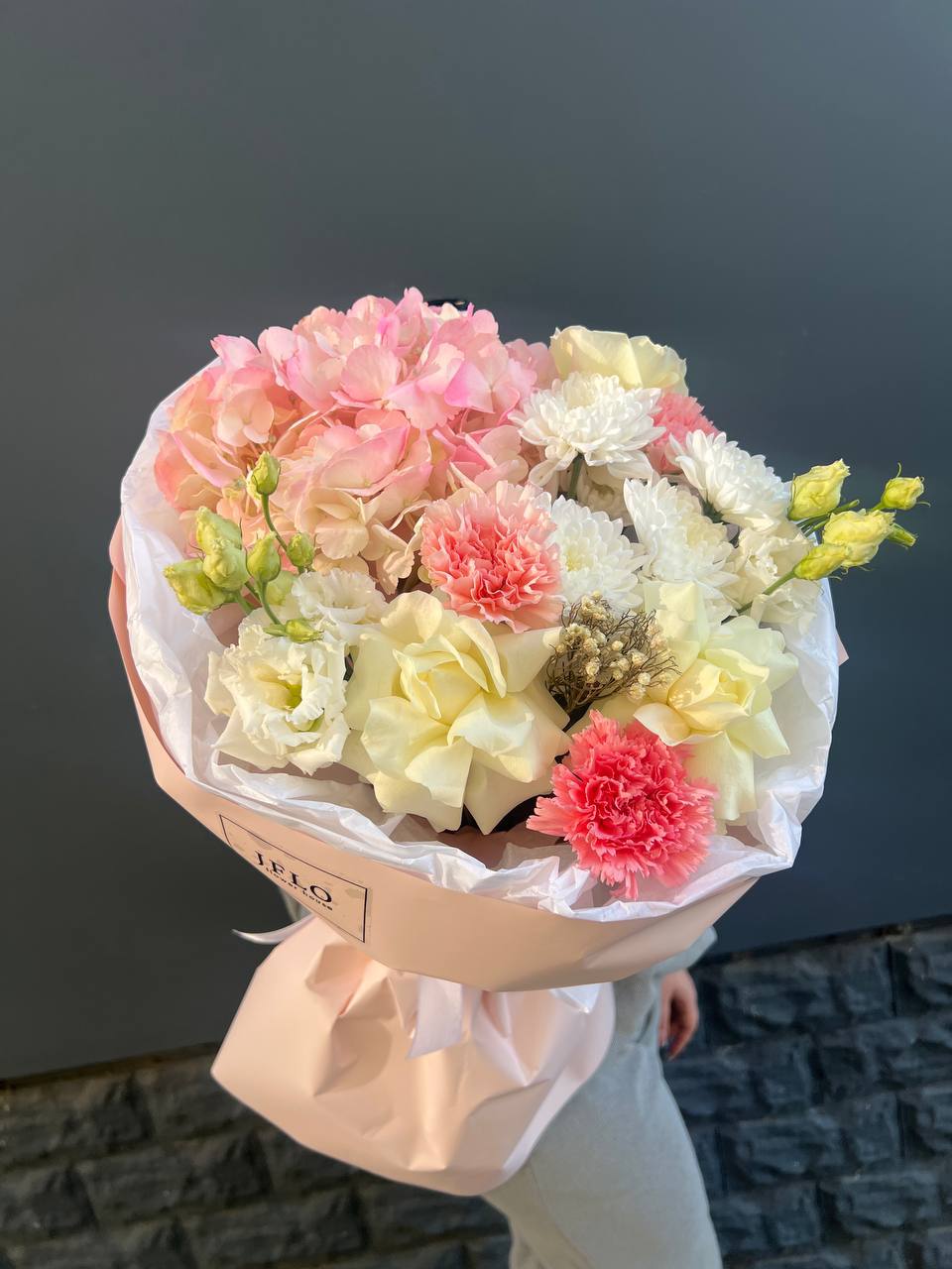 гортензия, белая роза, диантус, хризантема, эустома, озатамус, пленка.
