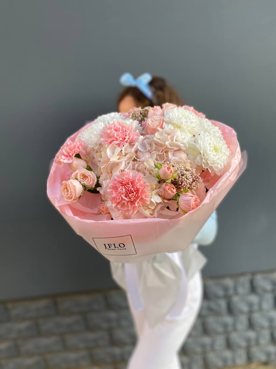Хризантемы держат форму долго и остаются свежими даже в жаркие дни. Диантус и антиринум добавляют сборной композиции разнообразия без лишних деталей. Воздушная упаковка сохраняет аккуратный вид.