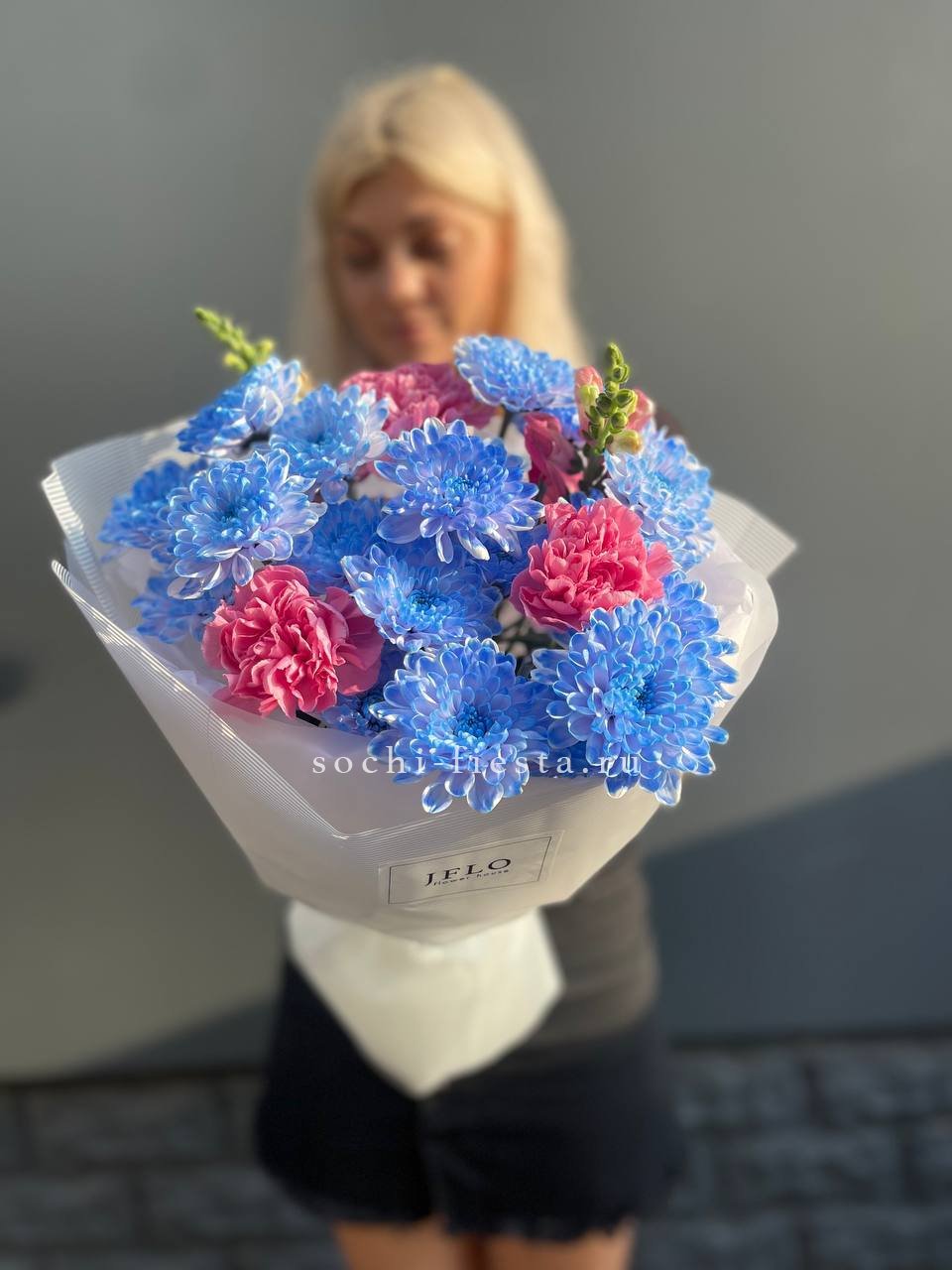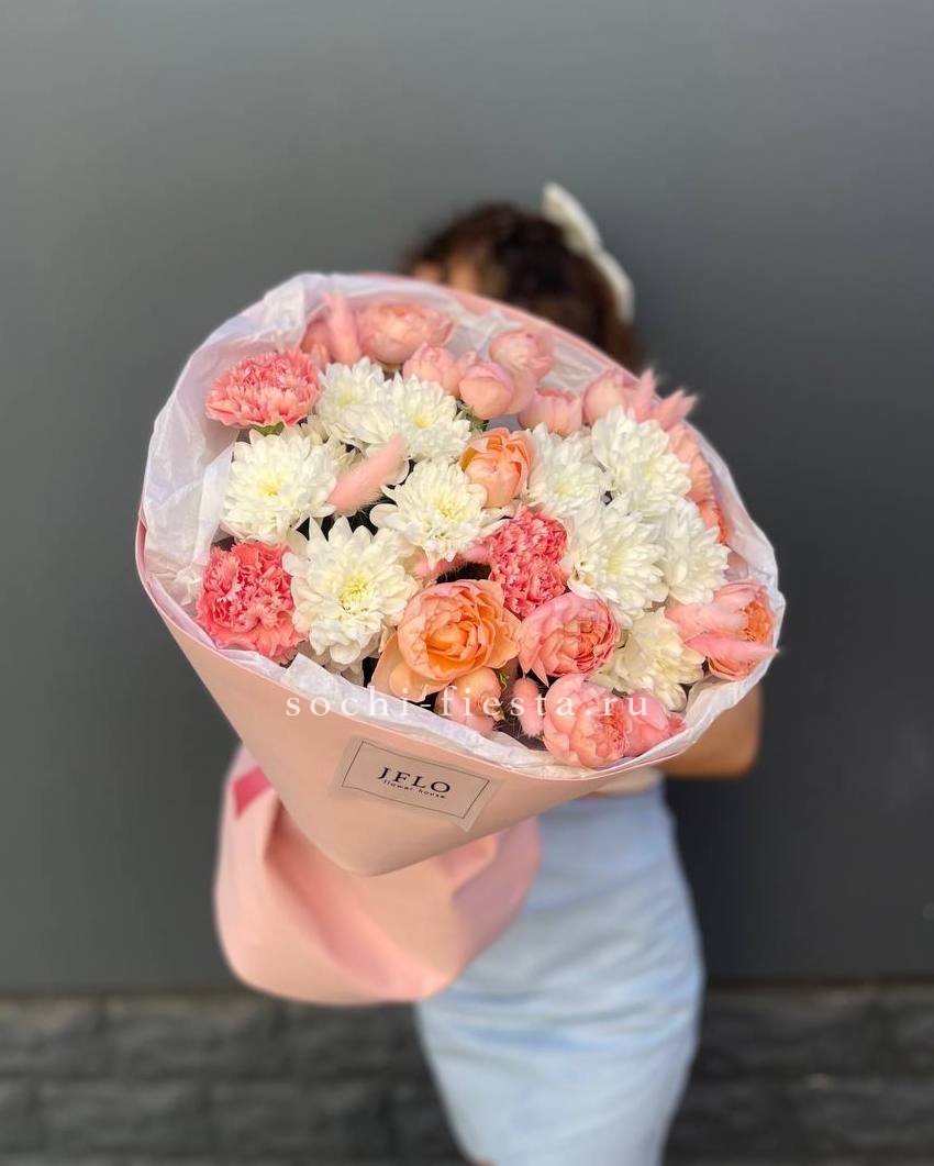 кустовые розы, хризантемы, диантусы, лагурус, лента и дизайнерская пленка.