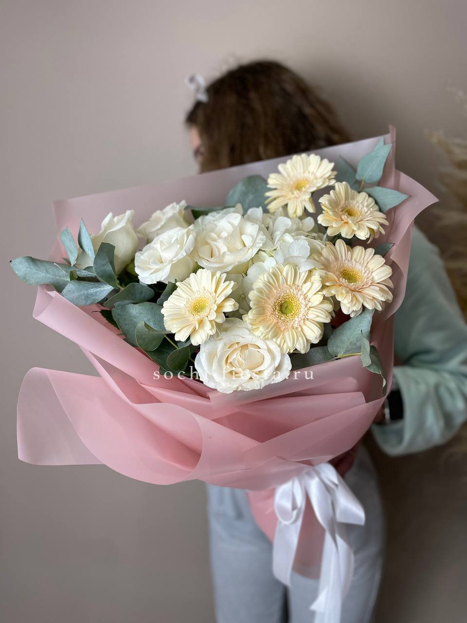 кустовые розы, кремовые розы, диантусы, эвкалипт лента и дизайнерская пленка.