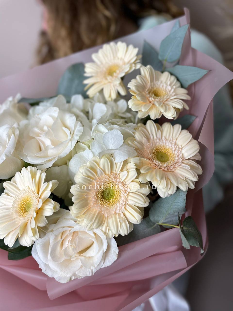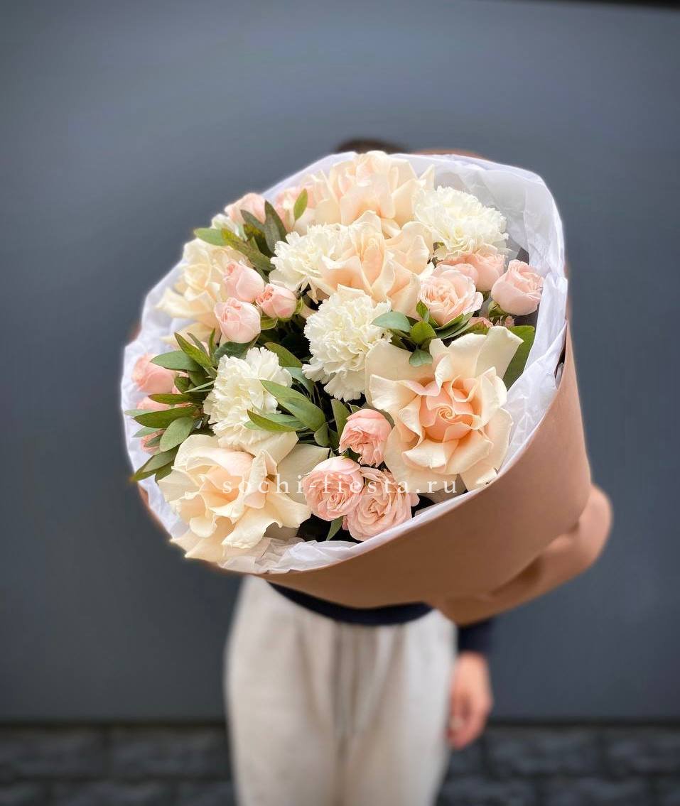 Кремовые и кустовые розы образуют спокойную цветовую гамму с тёплым подтоном. Диантусы добавляют объём, а эвкалипт вносит свежие нотки в общую картину.