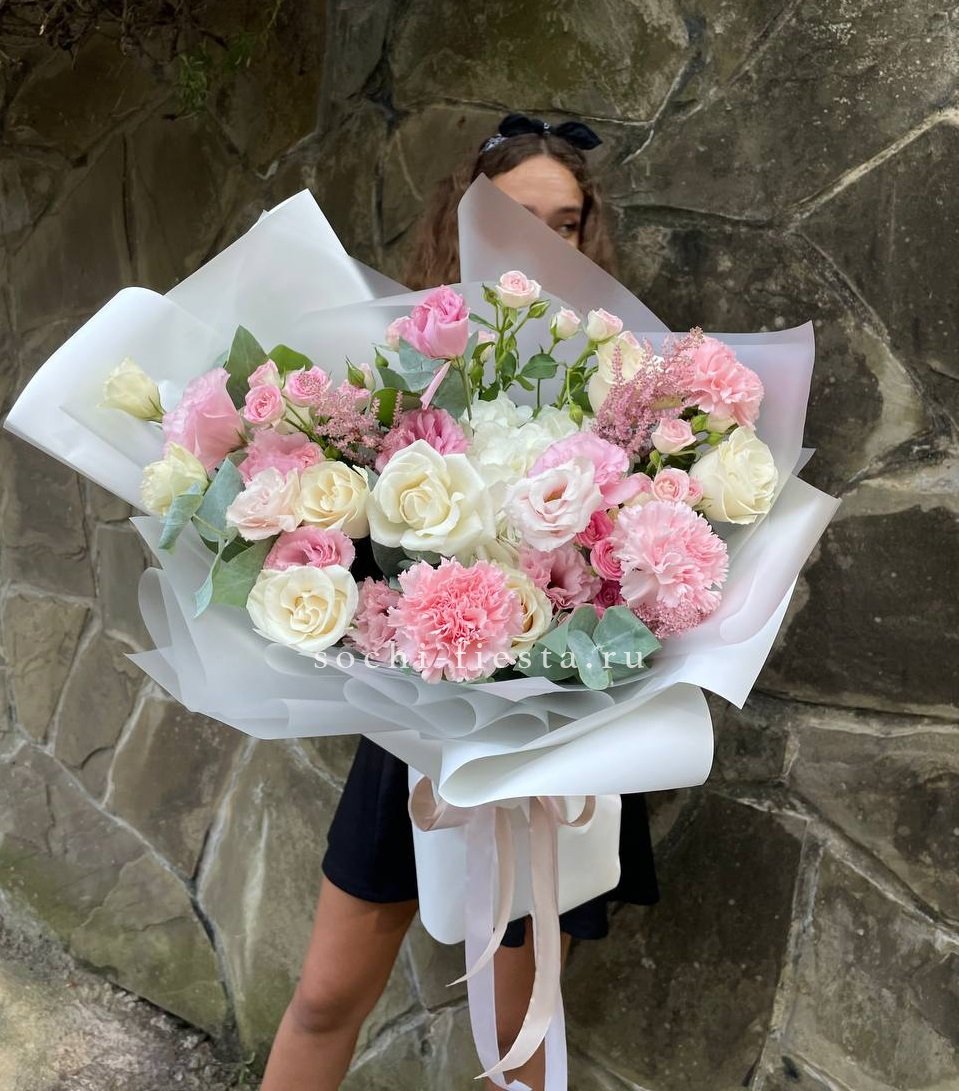 розы, гортензия, альстромерии, маттиола лента и дизайнерская пленка.