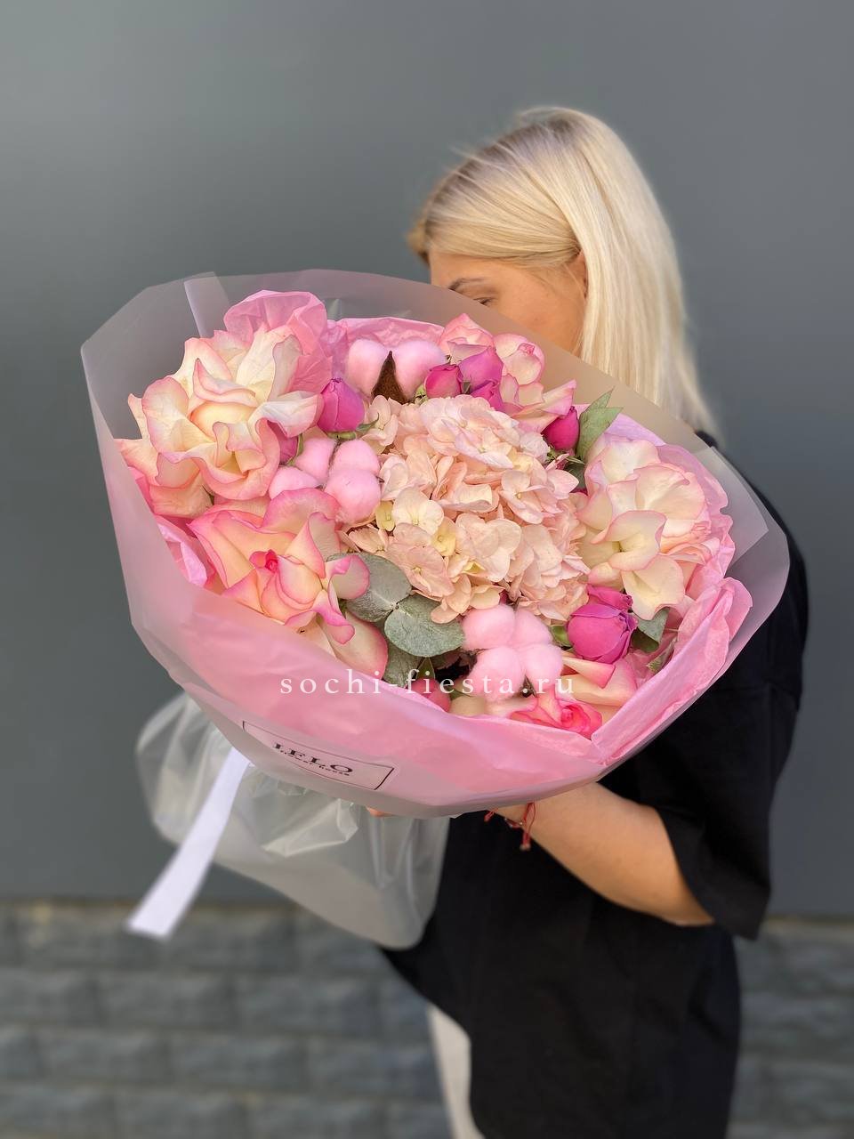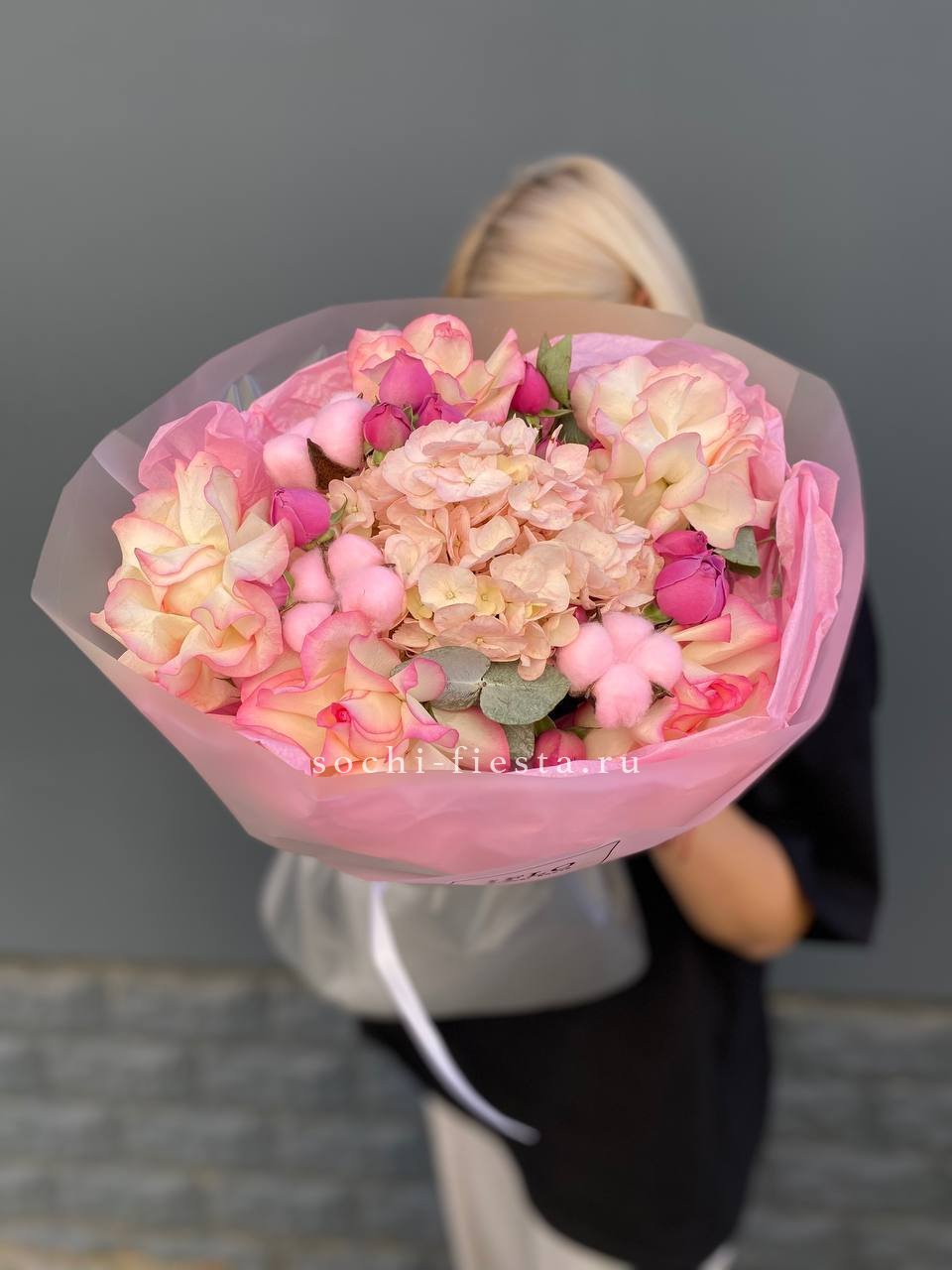 гортензия, диантус, кустовая пионовидная роза, эустома, вспомогательные цветы, эвкалипт, лента, дизайнерская упаковка.