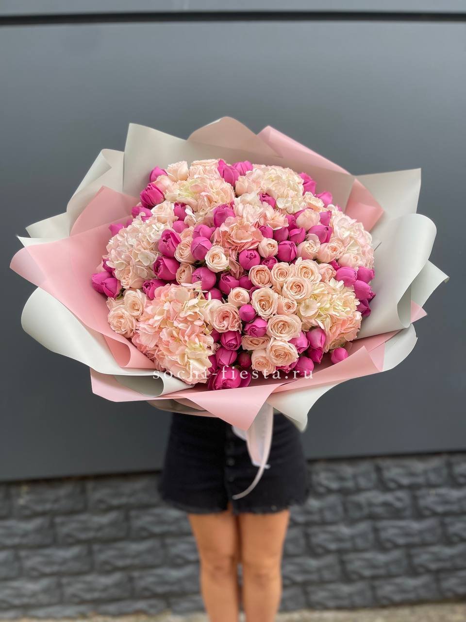 Этот пышный авторский букет напоминает нежное зефирное облако, в котором гармонично сочетаются объемные формы и изысканные оттенки. Композиция представляет собой микс из крупных соцветий гортензии и кустовых роз в пастельной гамме.