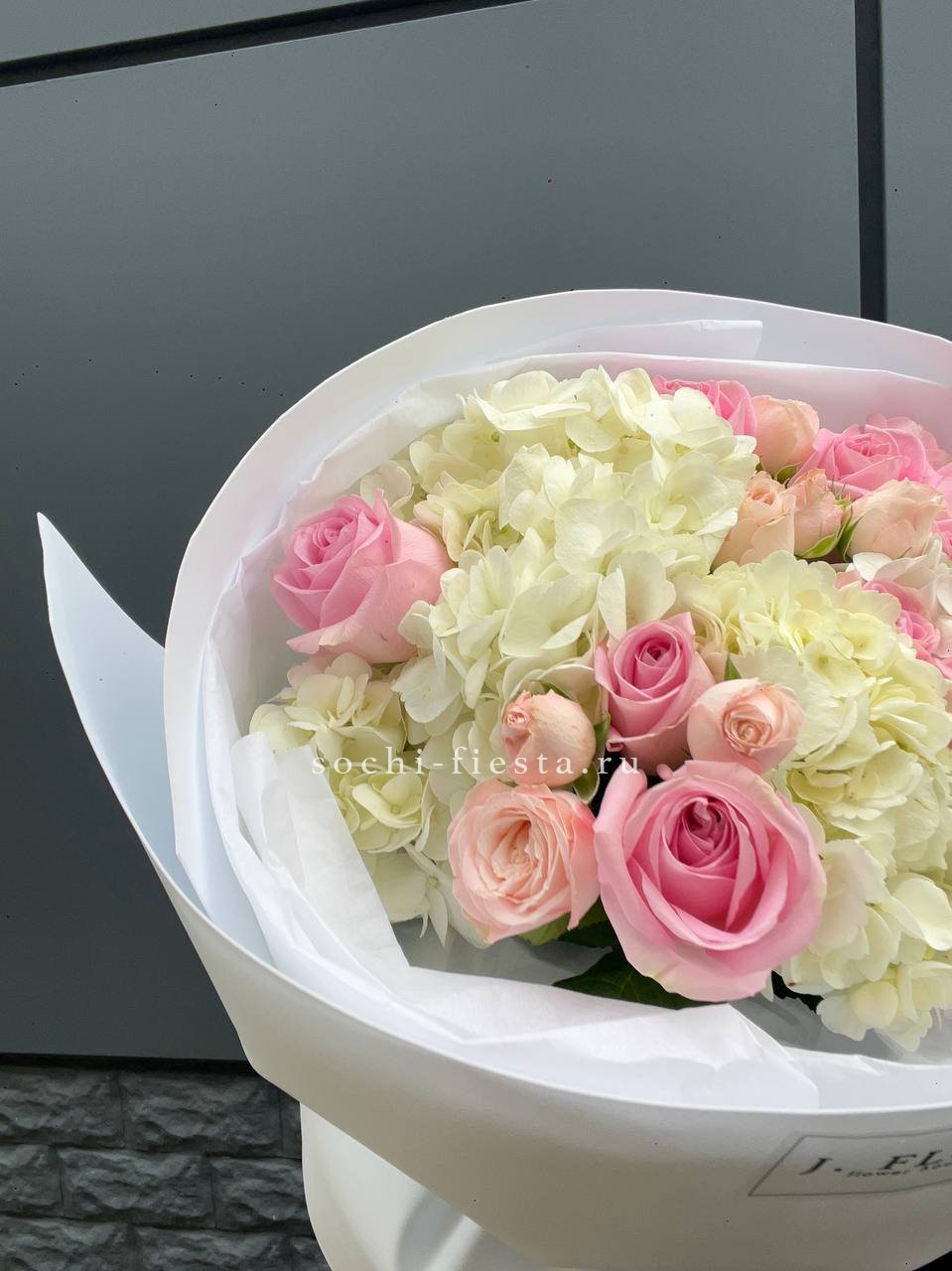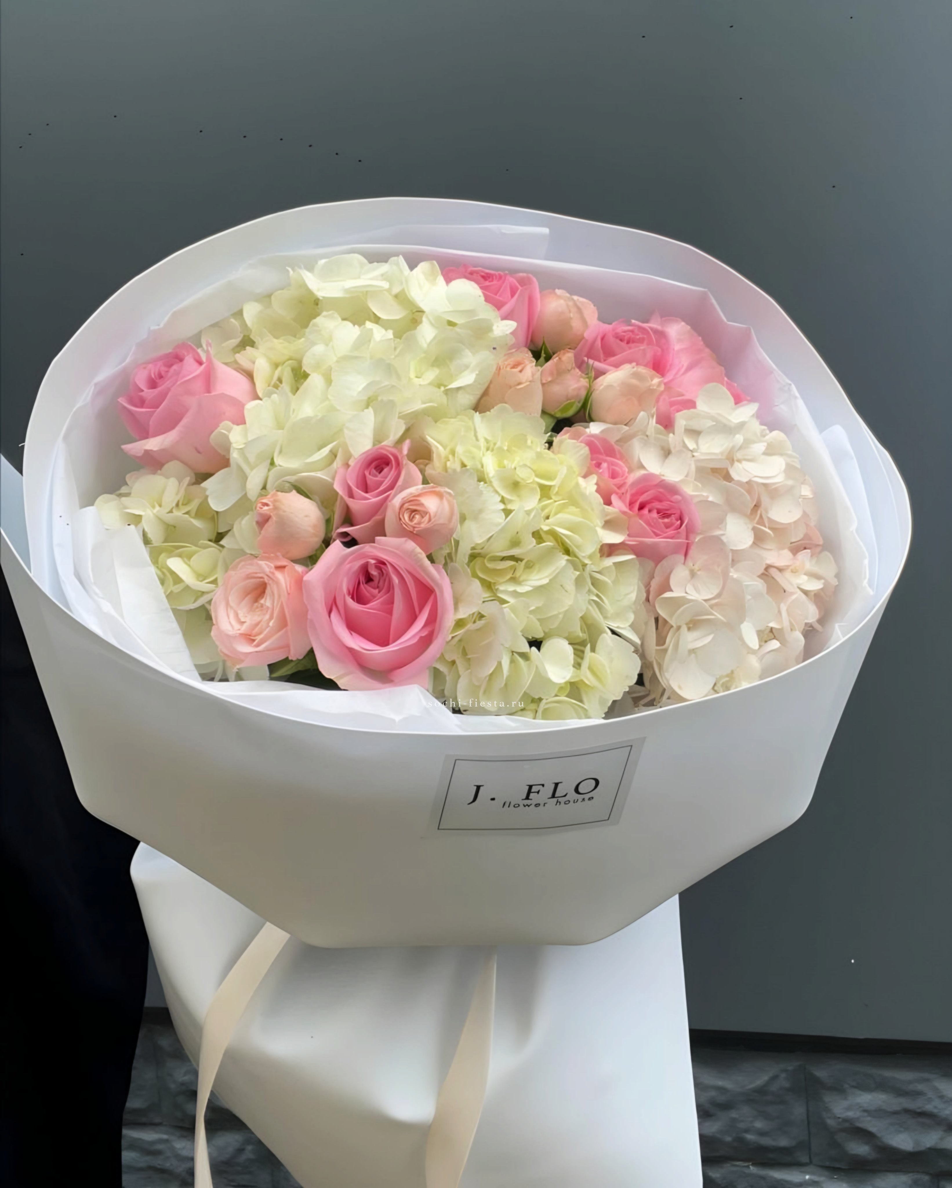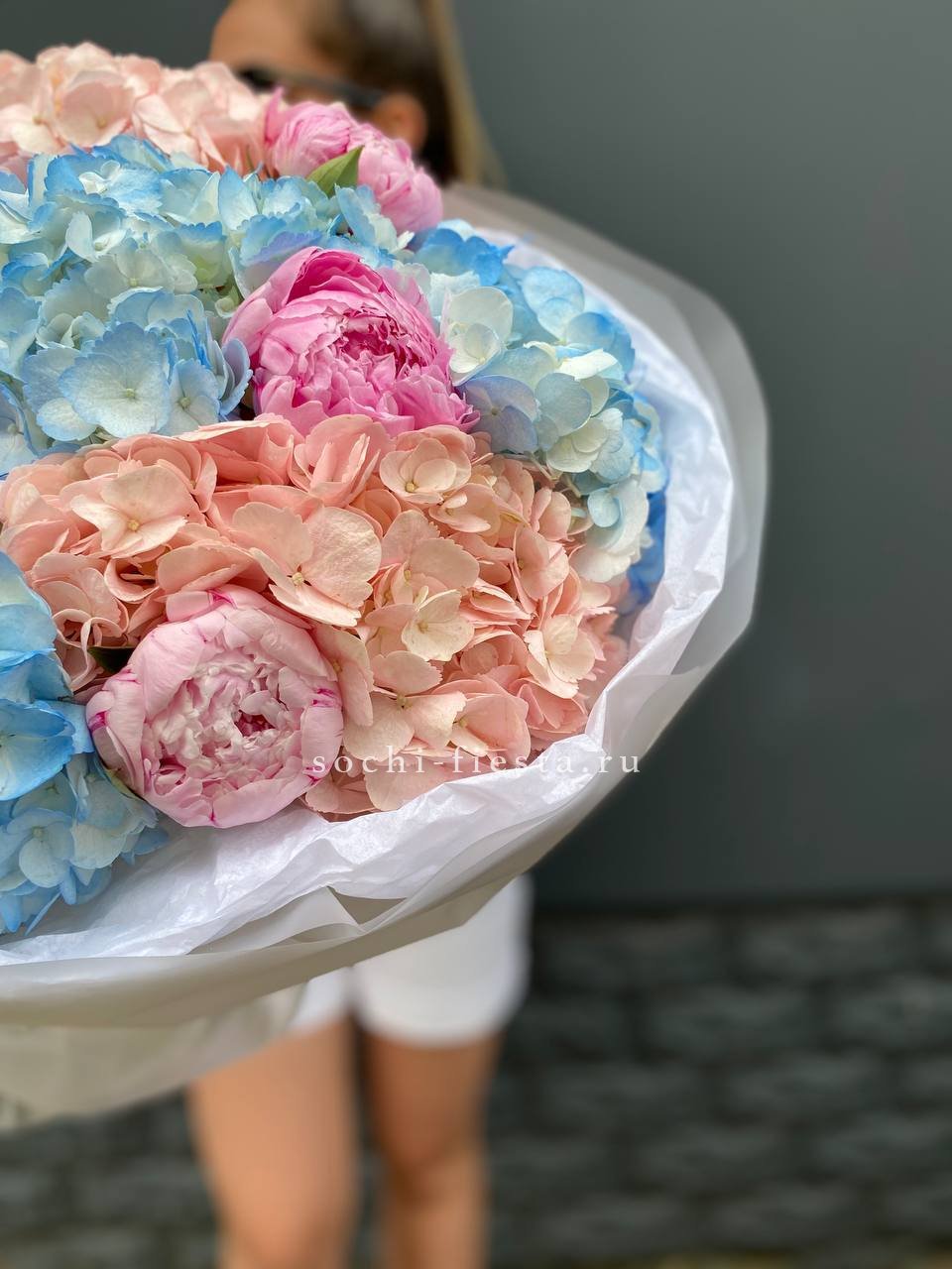 Два отдельных букета в одной композиции: пышные головки гортензий и густомахровые пионы. Каждая часть завернута в тишью и пленку, сохраняя свою форму и свежесть.