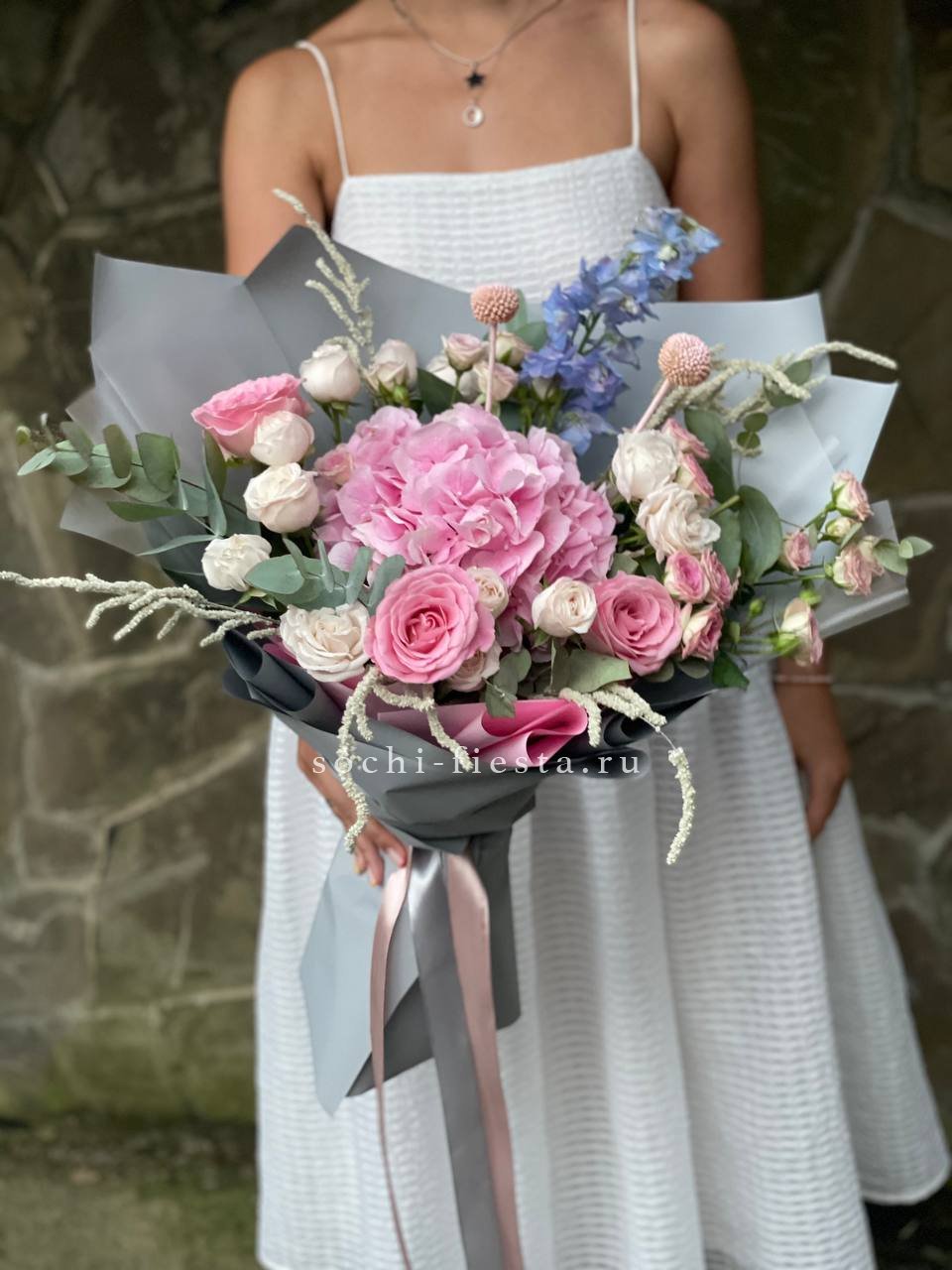 гортензия, эустома, кустовые розы, одноголовые розы, эвкалипт, вспомогательная зелень.