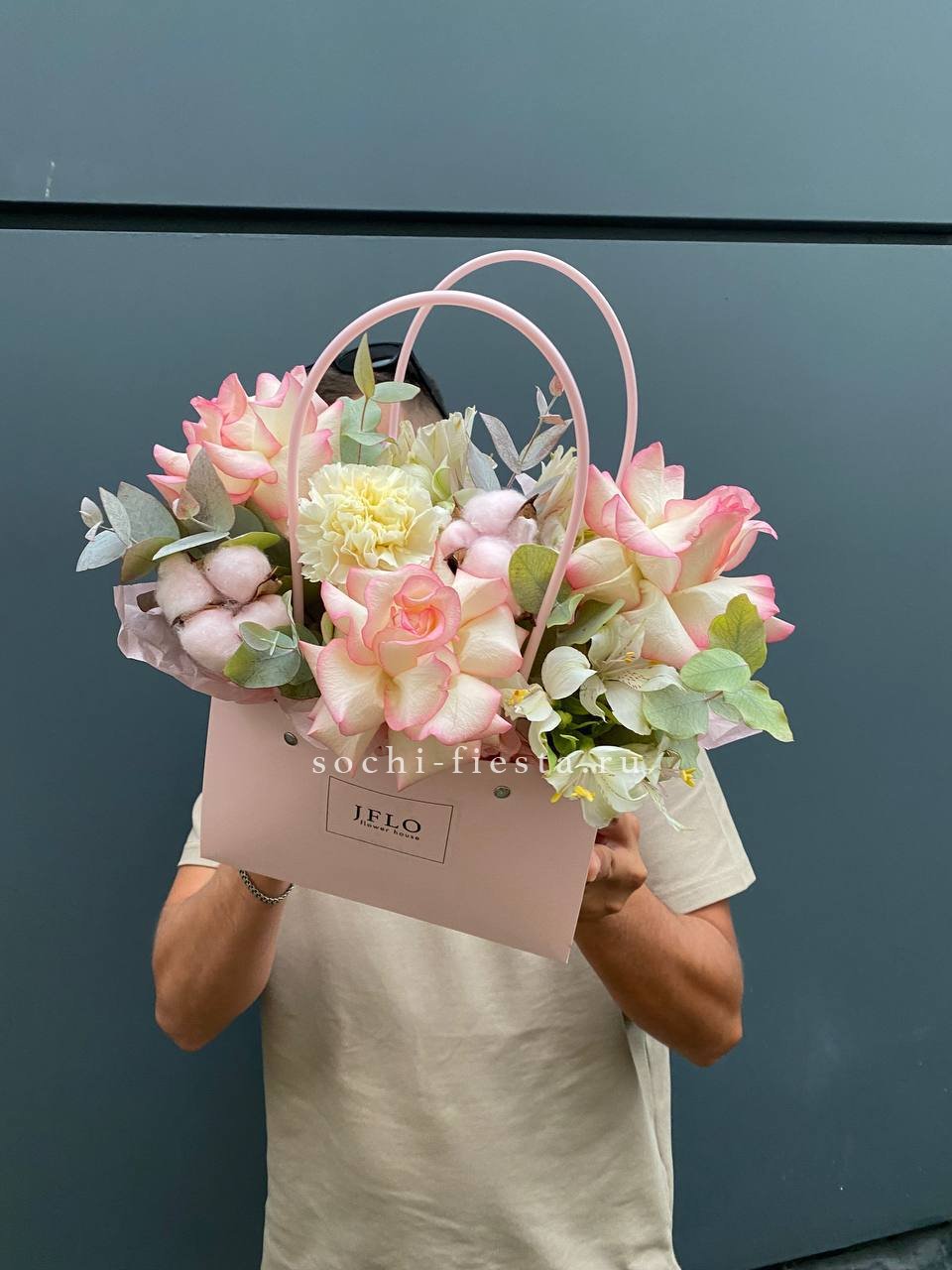 джумилия, хлопок, диантус, альстромерия, эвкалипт.
