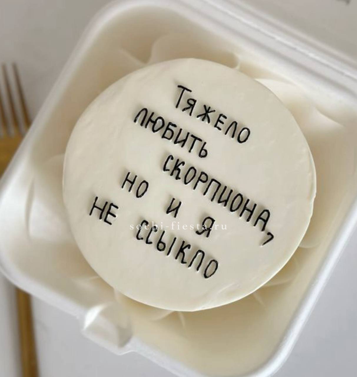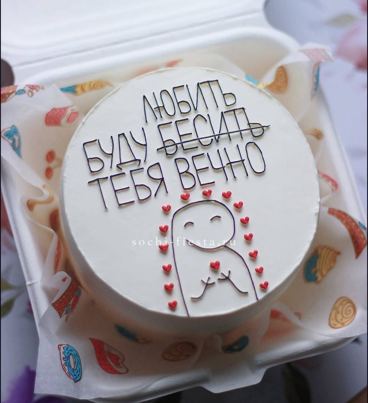 Юмор в съедобной форме — это когда крем уложен ровно, а надпись заставляет улыбнуться. Небольшой формат помещается в ладонях и легко становится центром стола. Выбор из двух начинок добавляет интригу.